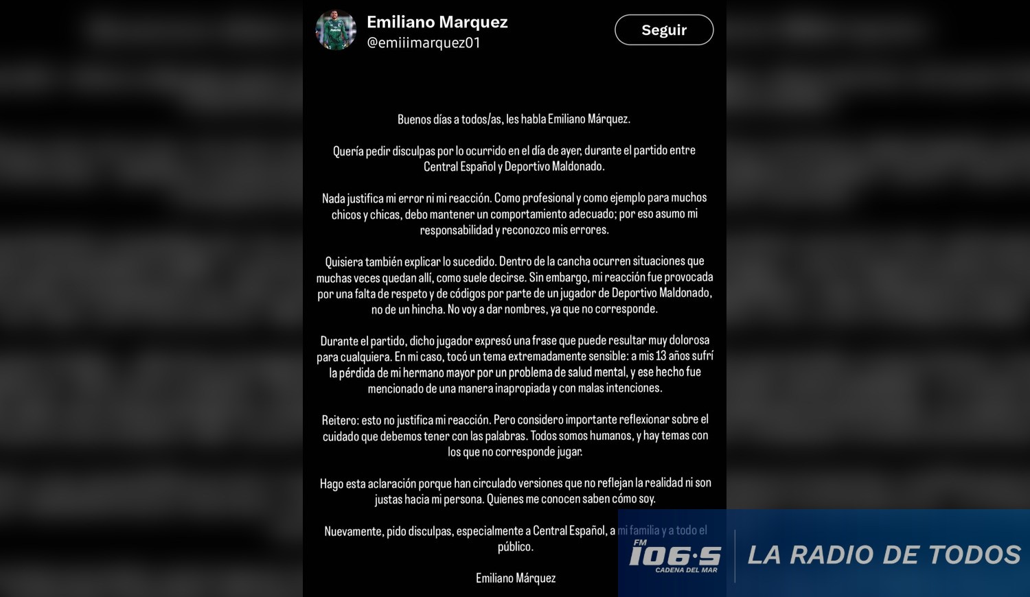 Quisiera también explicar lo sucedido. Dentro de la cancha ocurren situaciones que muchas veces quedan allí, como suele decirse. Sin embargo, mi reacción fue provocada por una falta de respeto y de códigos por parte de un jugador de Deportivo Maldonado, no de un hincha. No voy a dar nombres, ya que no corresponde.