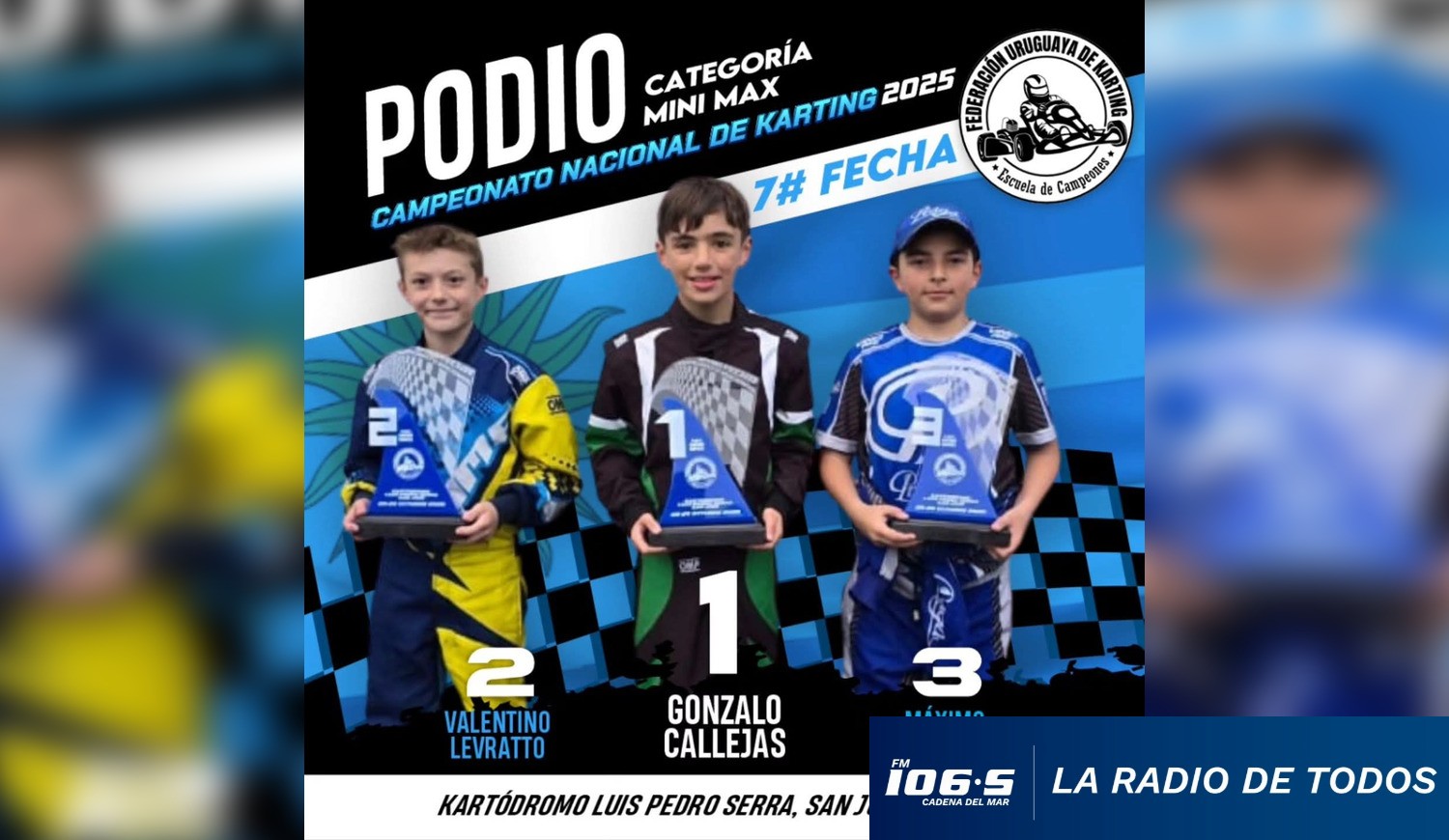 Según informó nuestra corresponsal Mara Princesa Arévalo, Gonzalo Callejas, el joven piloto piriapolense de 12 años que emociona a todo el país, volvió a brillar: logró podio nuevamente en la séptima fecha del campeonato Minimax, consolidando su nivel y su camino hacia el gran desafío internacional.