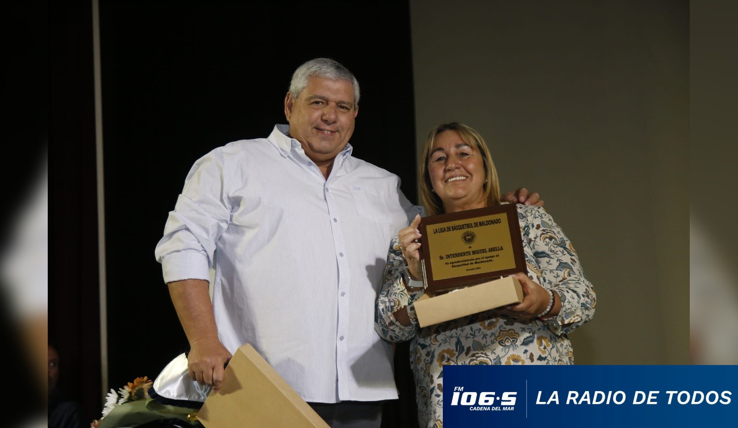 La Liga de Básquetbol de Maldonado rindió un homenaje al intendente Miguel Abella (representado por su esposa Marita Sánchez de Abella) durante el acto de premiación de la temporada, llevado a cabo en la noche de este miércoles 26 de noviembre en el Teatro Cantegril.