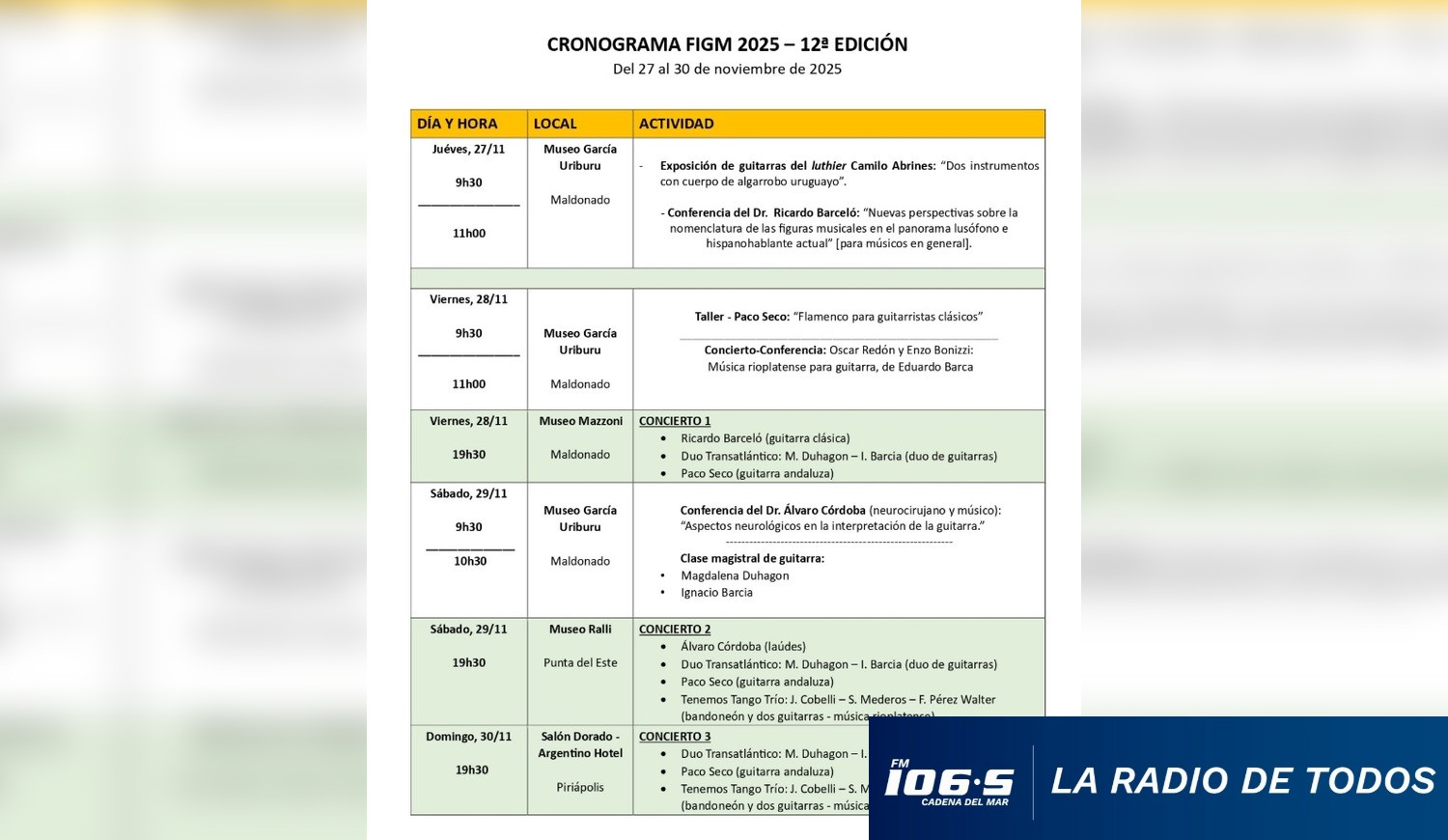 El Festival Internacional de Guitarra de Maldonado (FIGM) está listo para llevar a cabo su 12ª edición, un evento que se desarrollará entre el 27 y el 30 de noviembre en distintas localidades del departamento. La propuesta, con entrada libre y gratuita hasta completar el aforo, ofrecerá una rica agenda de conciertos, clases magistrales y conferencias.
