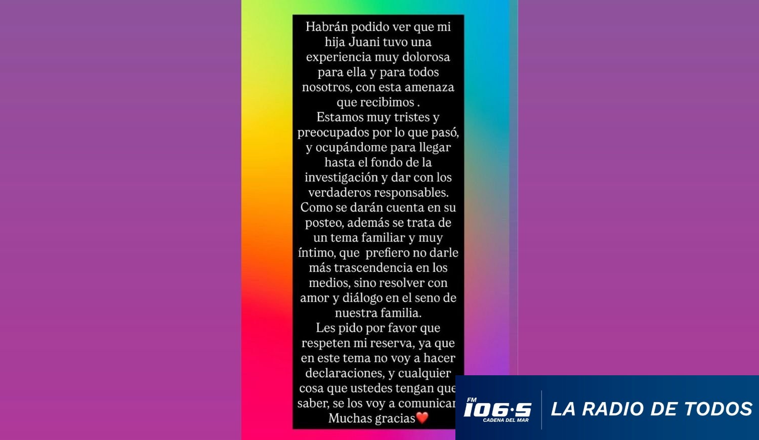 El mensaje fue acompañado por un fondo colorido y un corazón rojo, símbolo de afecto y contención familiar, en un contexto de fuerte exposición pública tras las declaraciones de su hija menor.