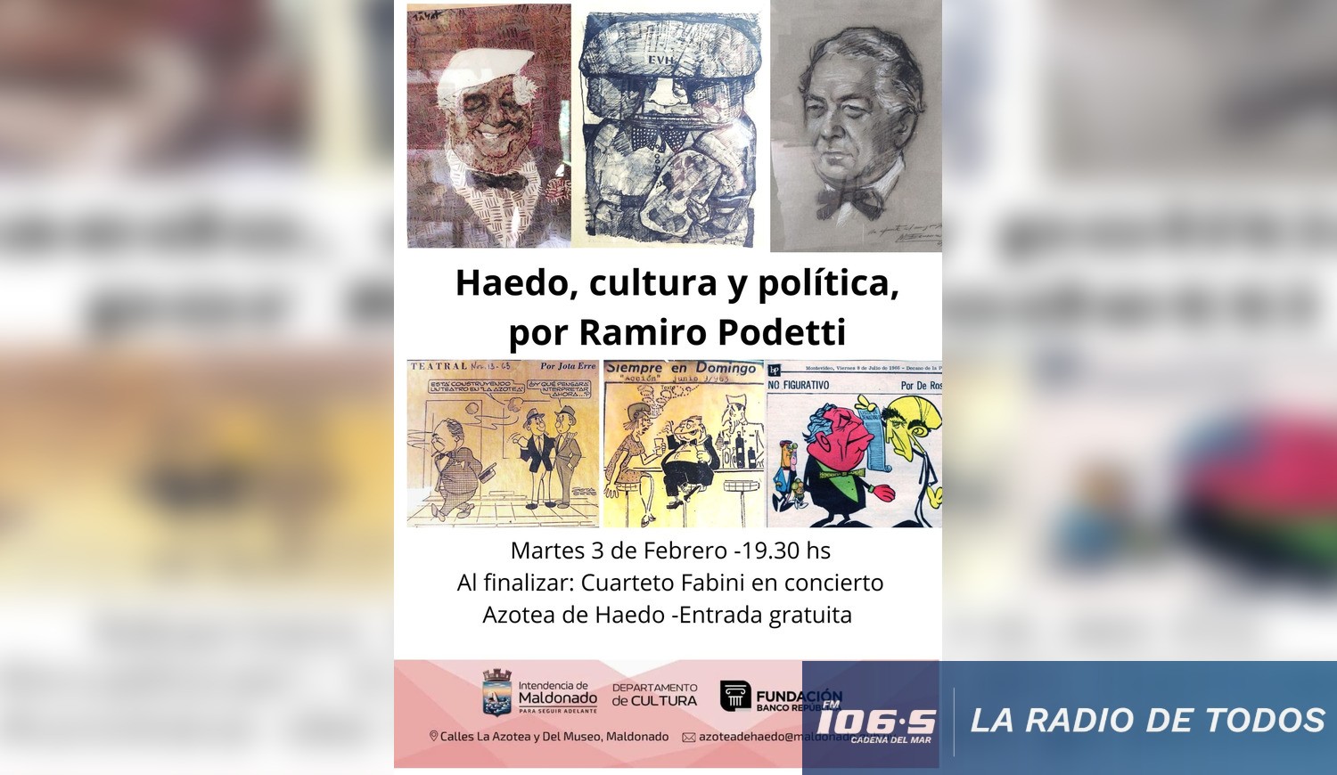 La Intendencia de Maldonado, a través de su Departamento de Cultura, invita a la comunidad a participar de la charla titulada "Haedo, cultura y política", que se llevará a cabo el martes 3 de febrero a las 19:30 horas en el emblemático Museo de la Azotea de Haedo.