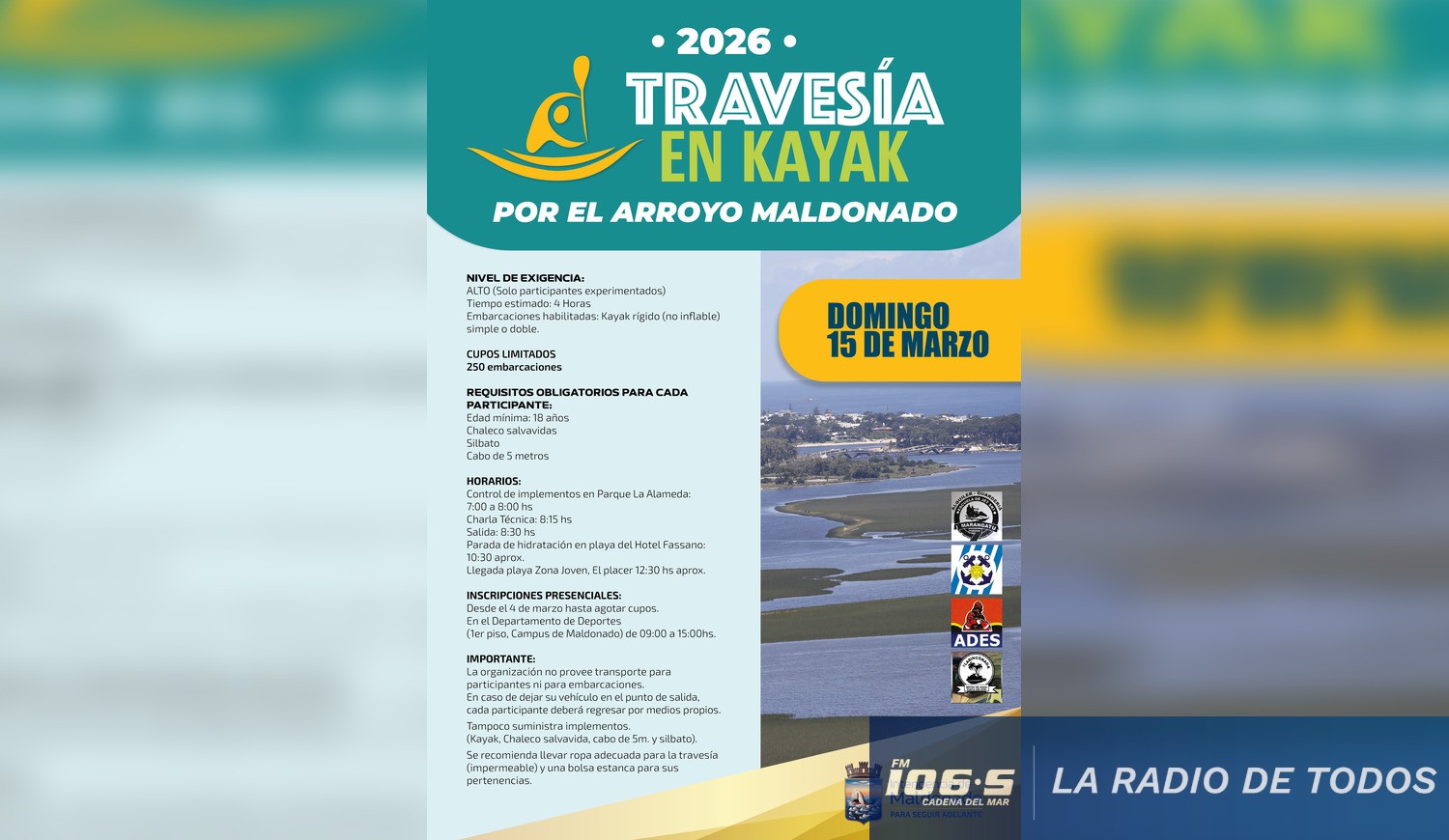 El nivel de exigencia es alto, lo que significa que es solo para participantes experimentados. El tiempo estimado es de 4 horas. Se aclara que las embarcaciones habilitadas son kayaks rígidos (no inflables) simples o dobles.