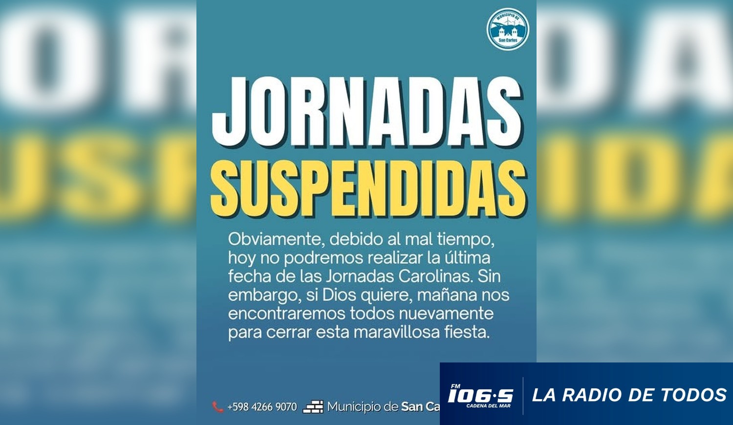 Debido a las desmejoras del tiempo, el evento cúlmine de las Jornadas Carolinas, previsto para este domingo en la Plaza Artigas, fue suspendido y reprogramado para este lunes 17 de noviembre. Las persistentes lluvias y el pronóstico desfavorable hicieron inviable la realización de las actividades al aire libre, según informó el Municipio de San Carlos.