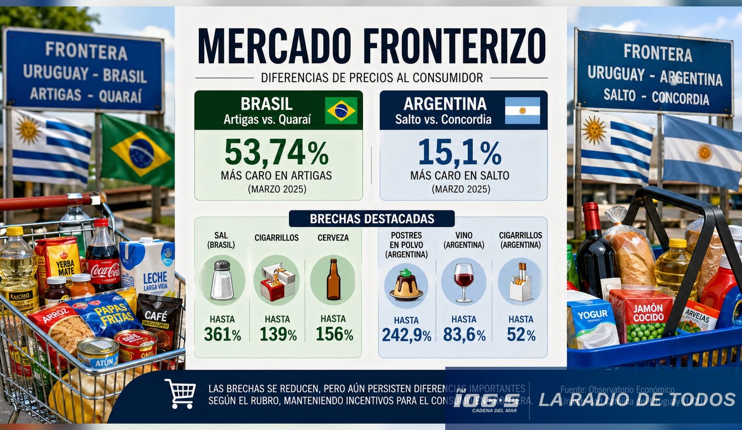 Las diferencias en el nivel de precios en las zonas de frontera continúan siendo relevantes para los consumidores uruguayos, aunque en los últimos meses se observa una moderación tanto con Brasil como con Argentina.