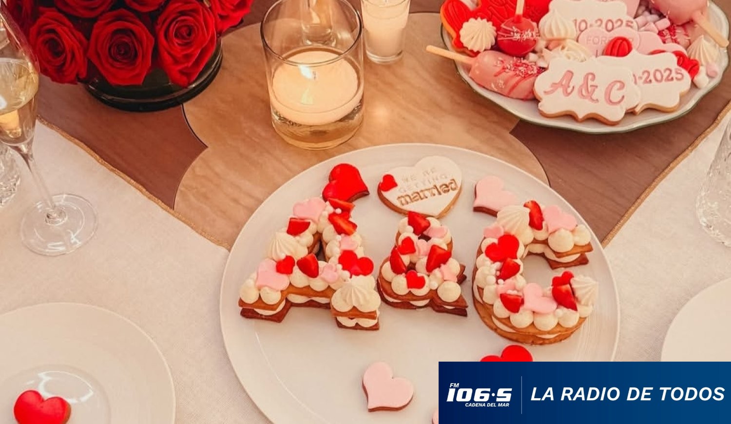 Leclerc organizó una pedida de mano de ensueño con un inmenso arreglo de rosas rojas en forma de corazón, velas y aperitivos.
