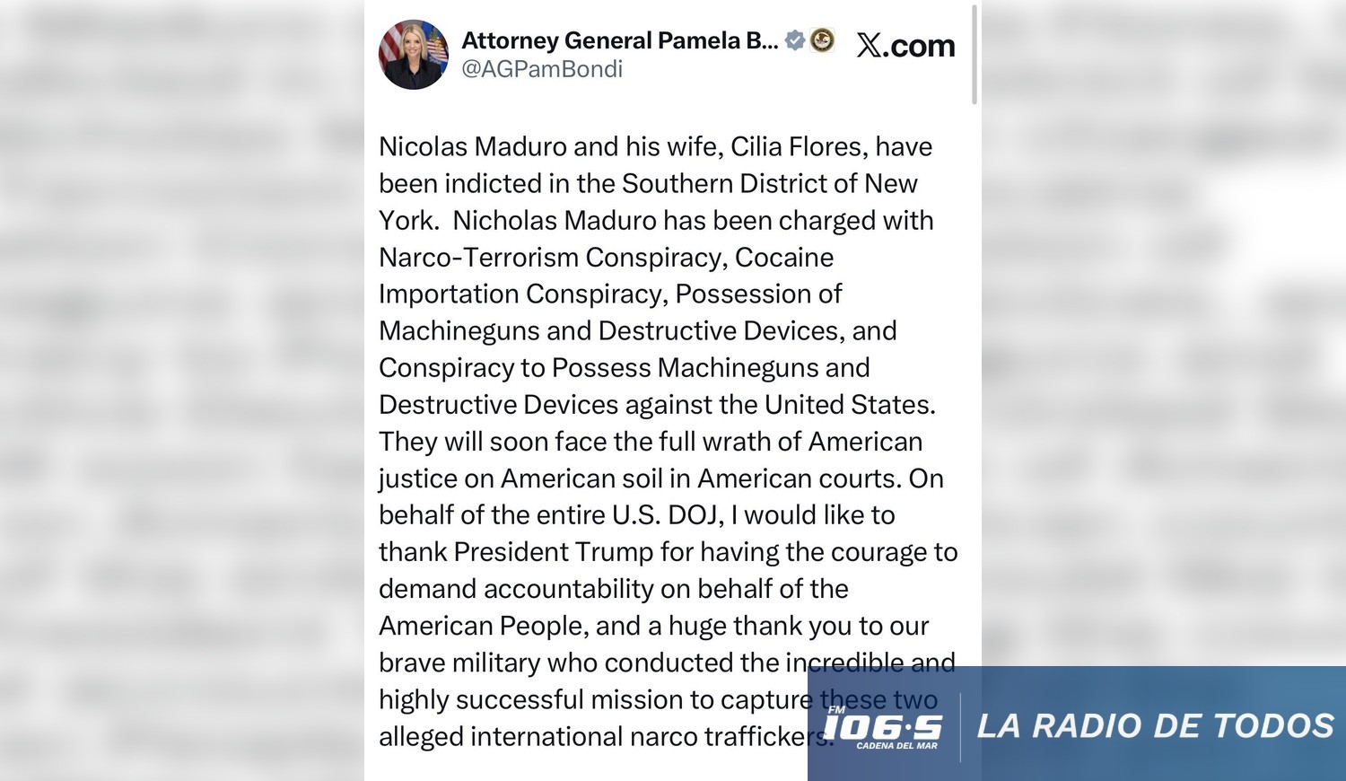 En su cuenta de X, la fiscal general estadounidense, Pamela Bondi, ha comunicado que Maduro y su mujer serán juzgados en Estados Unidos, acusados de narcotráfico y posesión de armas.