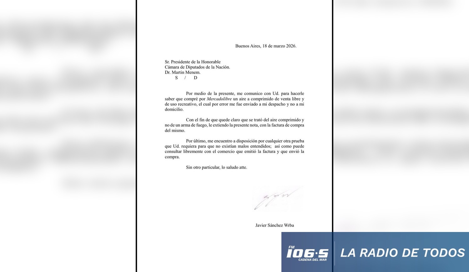 Tras el incidente, el legislador presentó una nota dirigida al presidente de la Cámara, Martín Menem, junto con la documentación correspondiente que acredita la compra y las especificaciones técnicas del artículo.