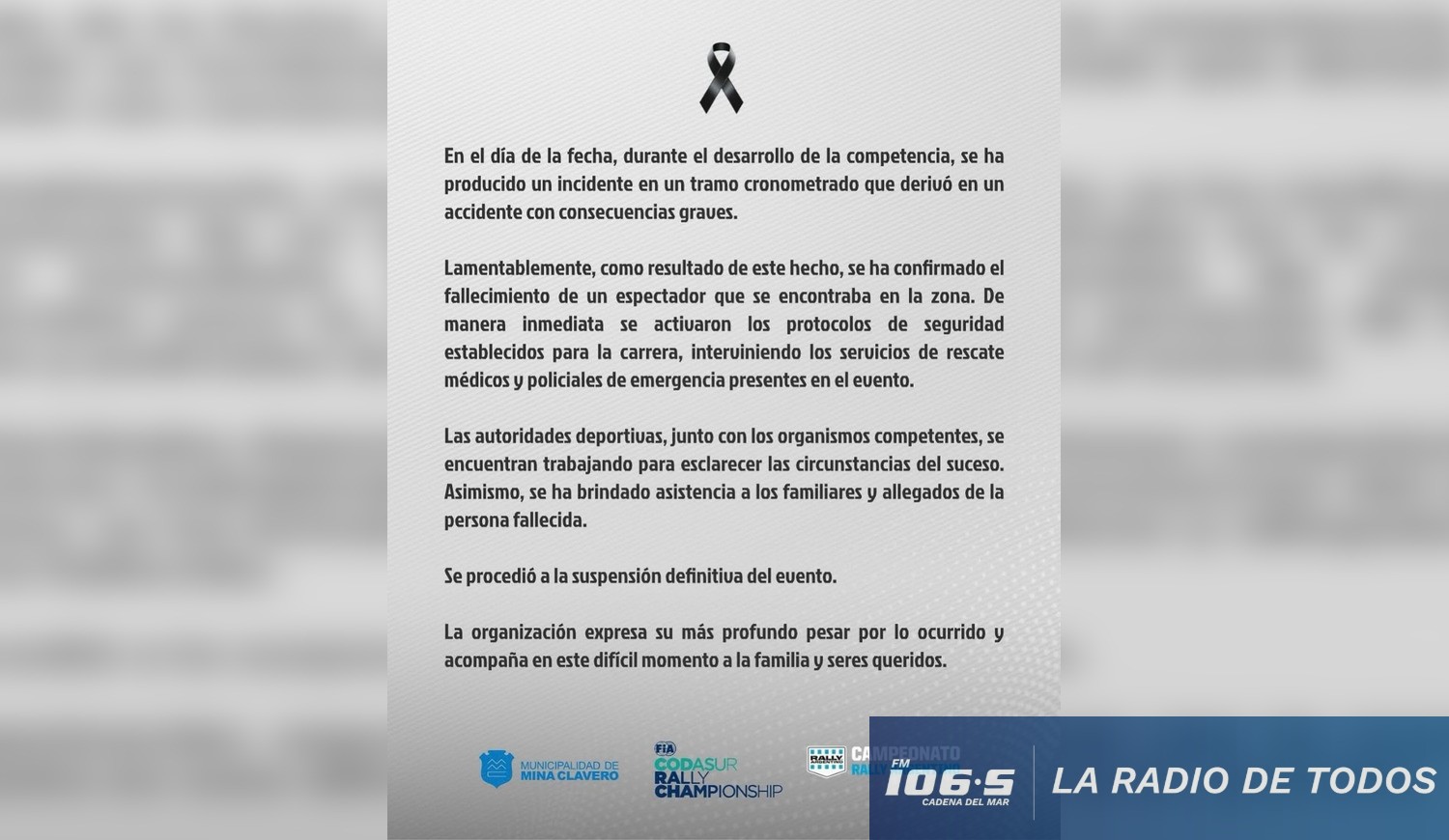 La jornada de cierre del Rally Sudamericano en Córdoba, Argentina, se vio teñida de luto este domingo tras un gravísimo accidente en el valle de Traslasierra.