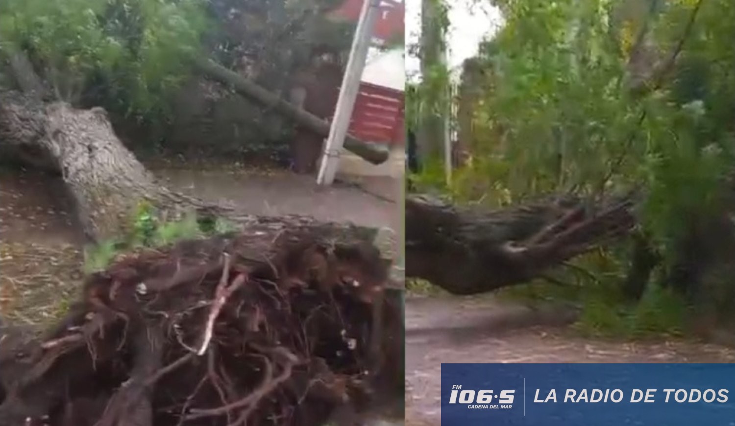 La combinación de vientos sostenidos y suelos saturados por la humedad provocó el desprendimiento de varios árboles de gran tamaño desde su base, los cuales impactaron violentamente contra las columnas de hormigón que sostienen el cableado público tal cual muestran las imágenes reportadas por oyentes de Cadena del Mar.