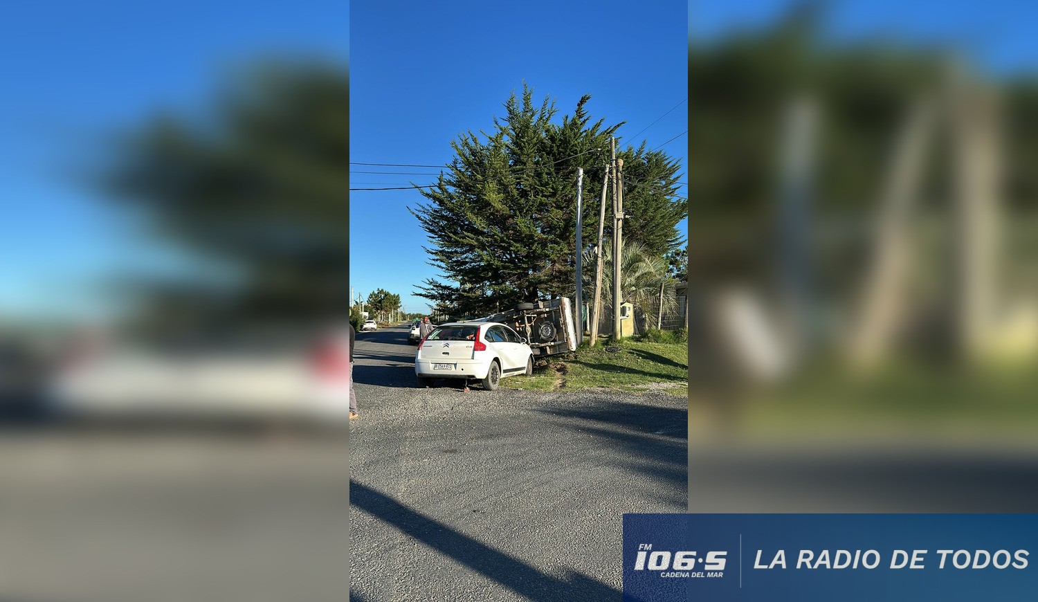 Un automóvil marca Citroën, de color blanco, colisionó con un camión utilitario que, producto del golpe, volcó sobre su lateral derecho quedando apoyado contra una columna de madera y una columna de hormigón de alta tensión.