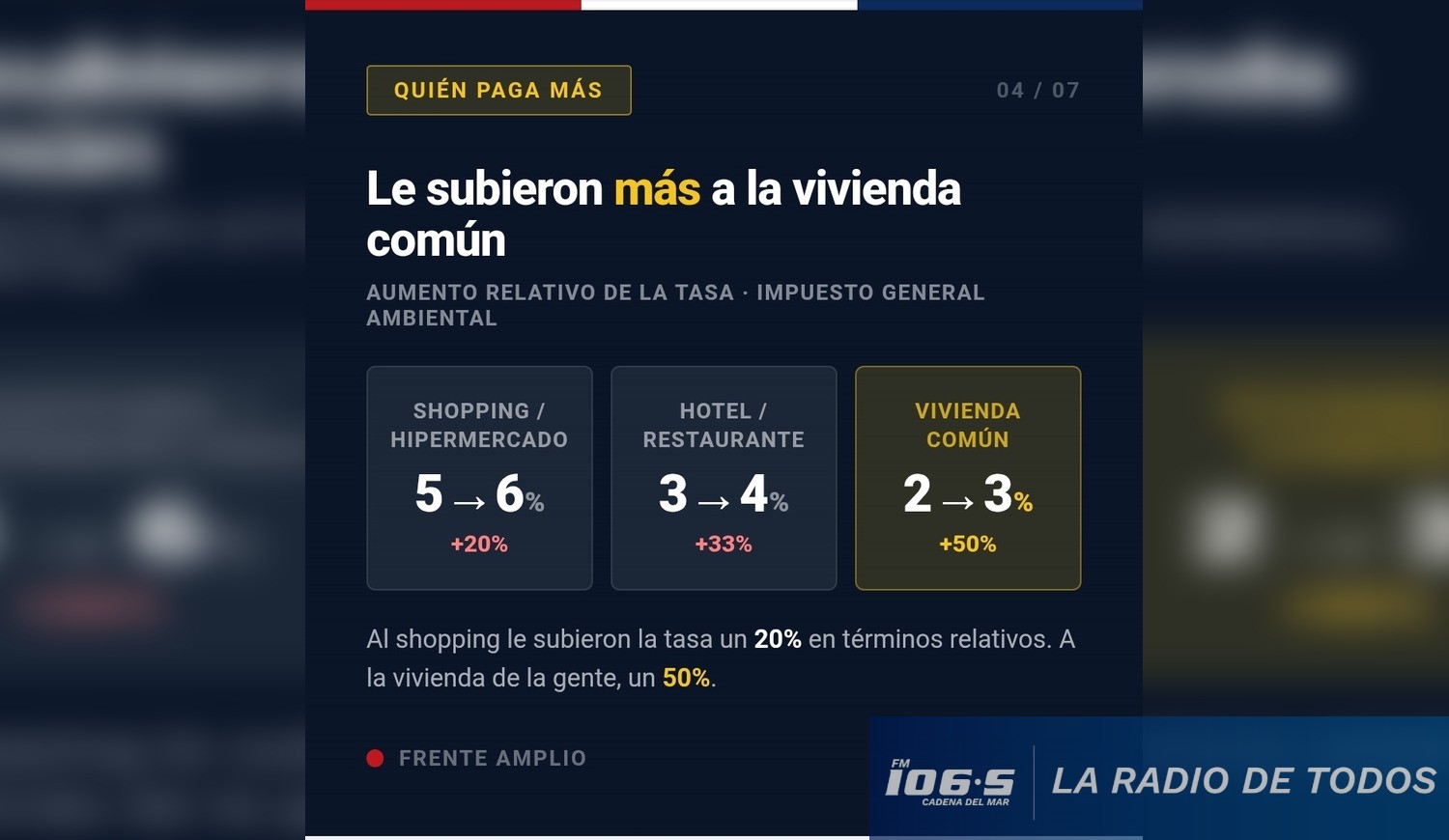El referente frenteamplista también hizo hincapié en la sustitución del Impuesto General Municipal por el nuevo Impuesto General Ambiental, señalando que esta modificación “implicó un aumento de la recaudación del 42,59%, pasando de 1.232 millones a más de 1.756 millones de pesos”.