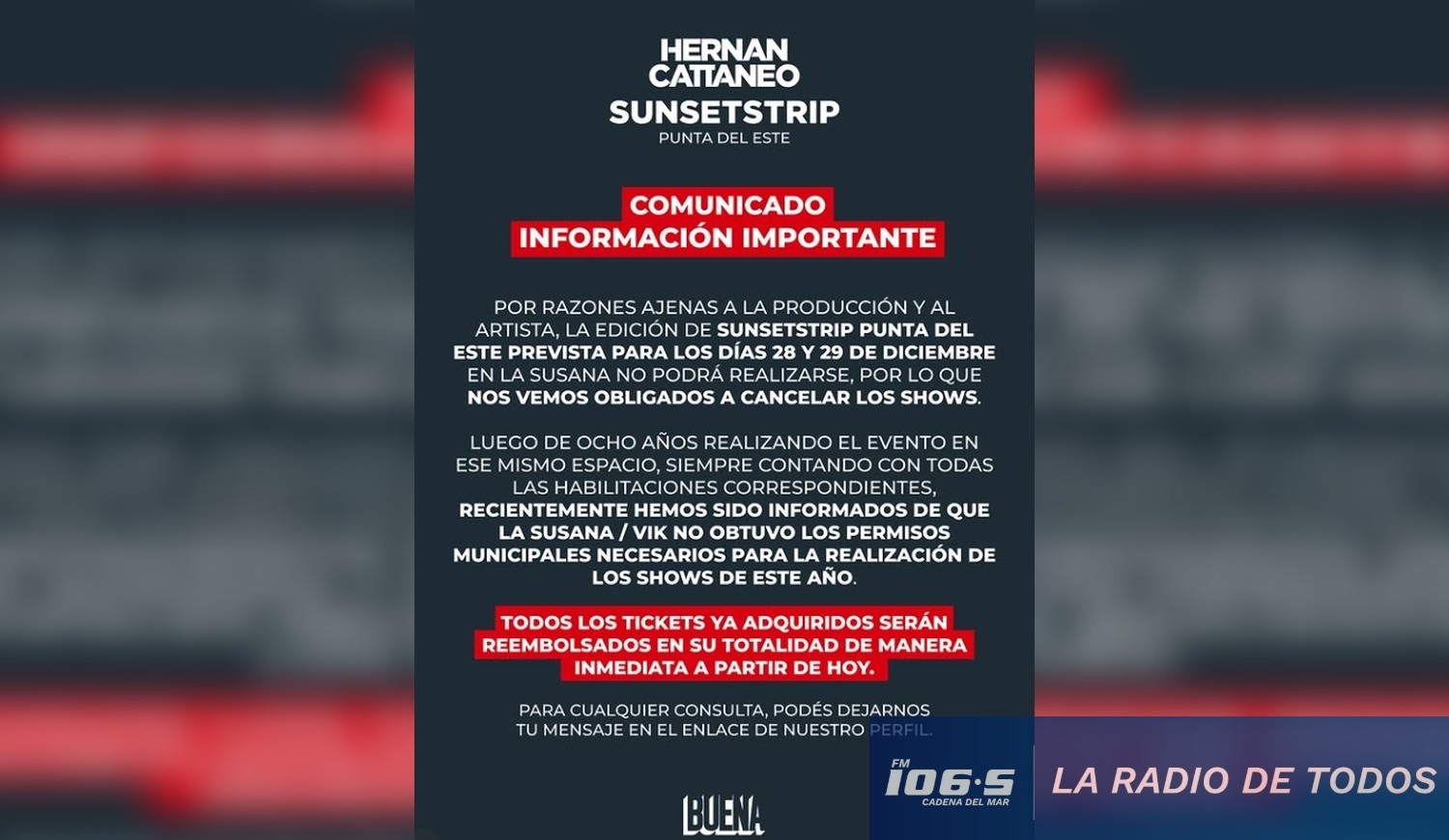 "Por razones ajenas a la producción y al artista, la edición de Sunsetstrip Punta del Este prevista para los días 28 y 29 de diciembre en La Susana no podrá realizarse, por lo que nos vemos obligados a cancelar los shows".