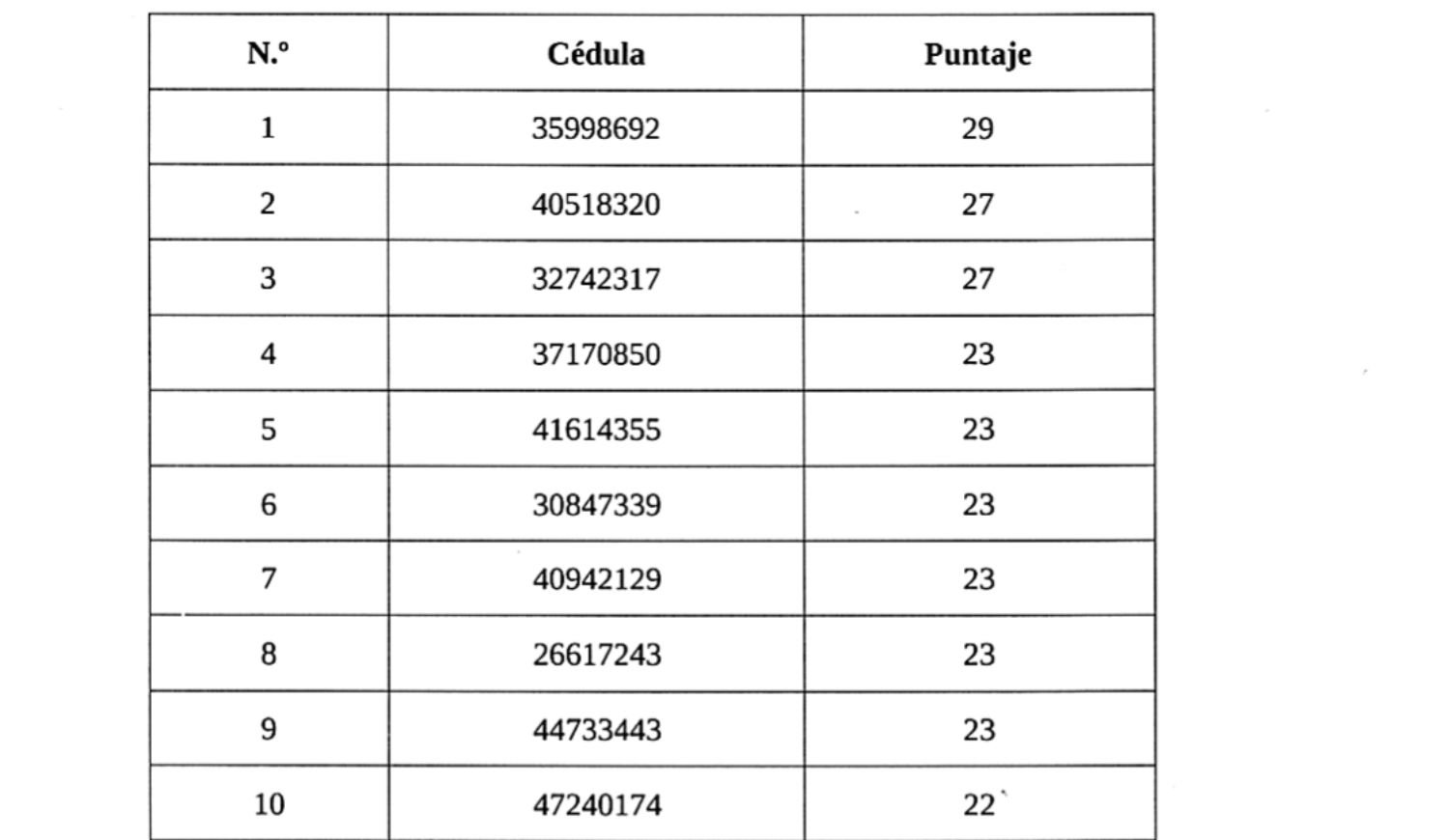 Quienes deseen conocer el detalle completo del listado, con números de cédula y puntajes correspondientes, podrán verlo en las imágenes publicadas dentro de nuestra página web.