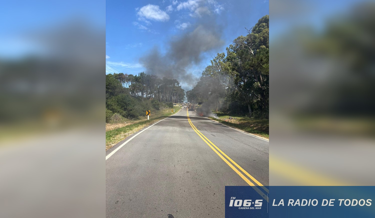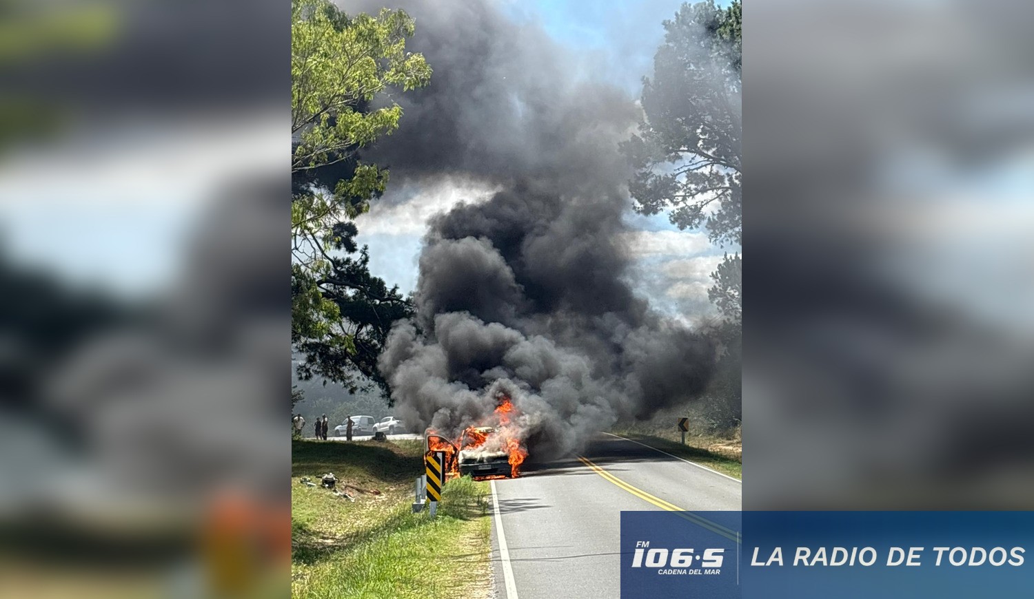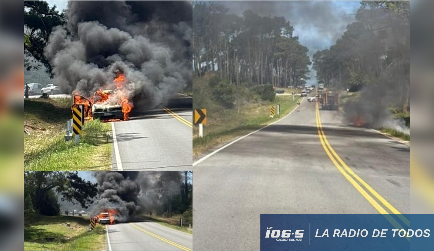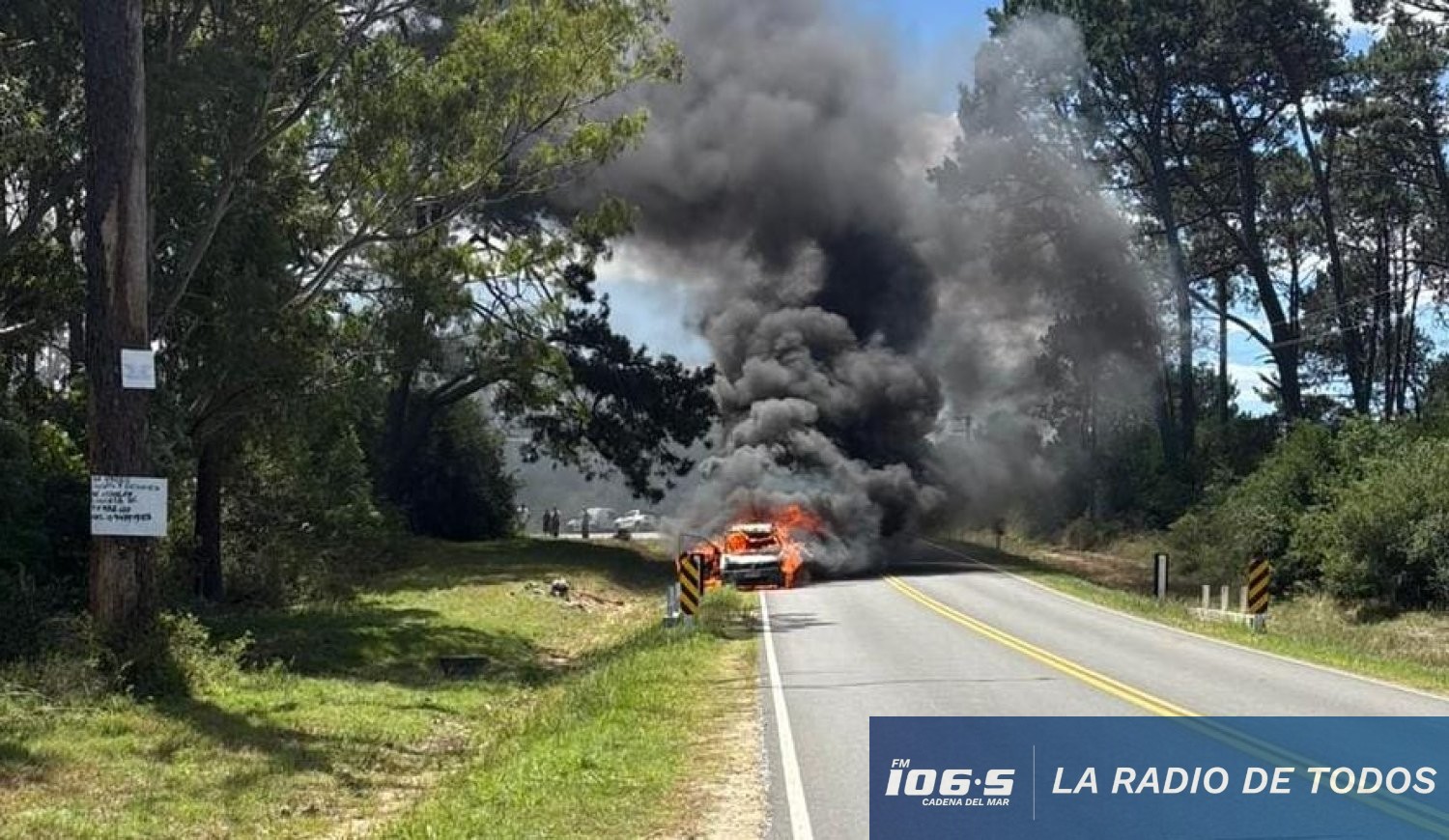 Las imágenes registradas muestran una densa columna de humo negro visible a gran distancia, llamas consumiendo por completo la camioneta sobre la banquina y el tránsito momentáneamente detenido en la zona, en un entorno arbolado característico del lugar. El material gráfico fue aportado por nuestro colega periodista de San José, quien documentó el desarrollo del siniestro.