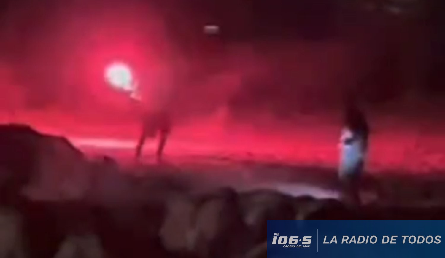 El video al que accedió Cadena del Mar muestra a personas corriendo por la arena mientras disparan proyectiles luminosos en distintas direcciones.