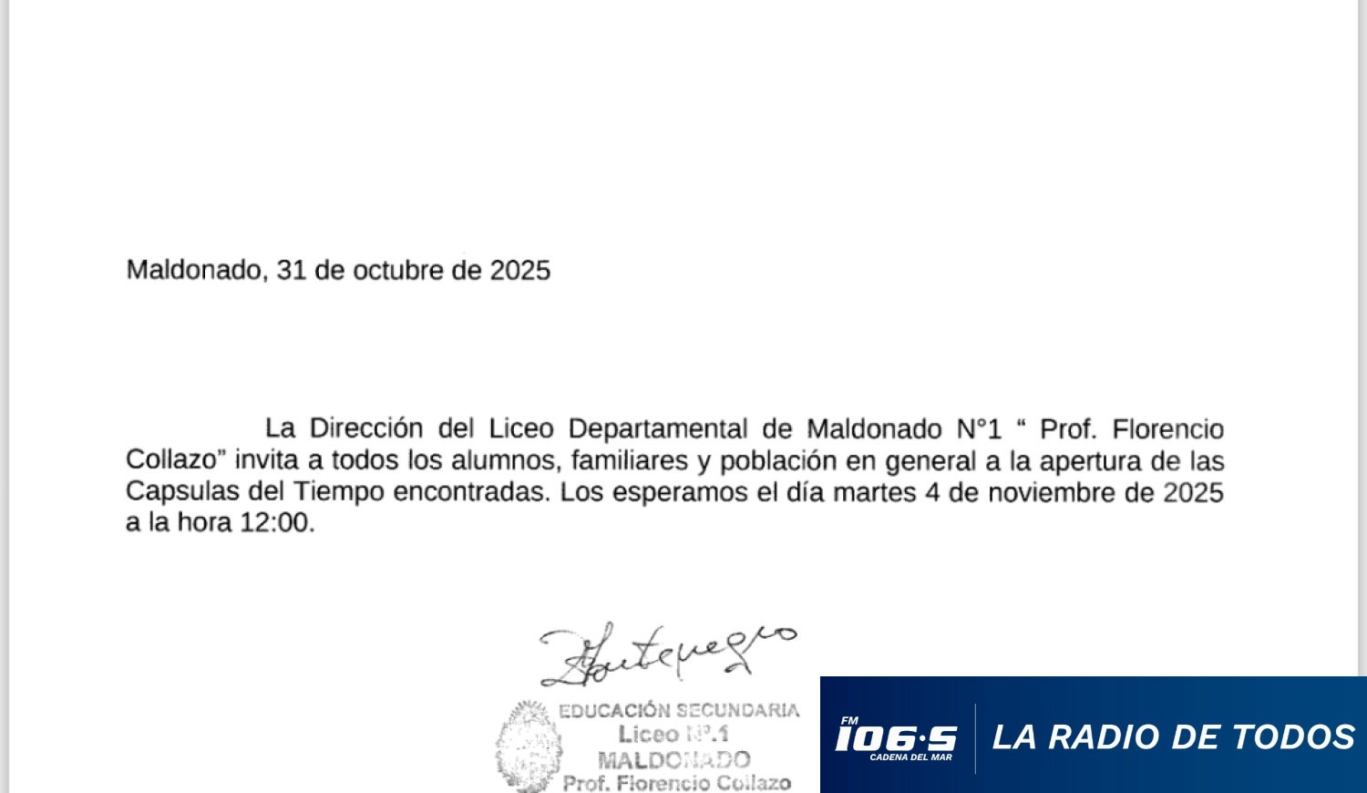 El Liceo Departamental de Maldonado N°1 "Prof. Florencio Collazo", dependiente de la Administración Nacional de Educación Pública (ANEP), ha convocado a la comunidad para la apertura de las Cápsulas del Tiempo encontradas en el centro educativo.