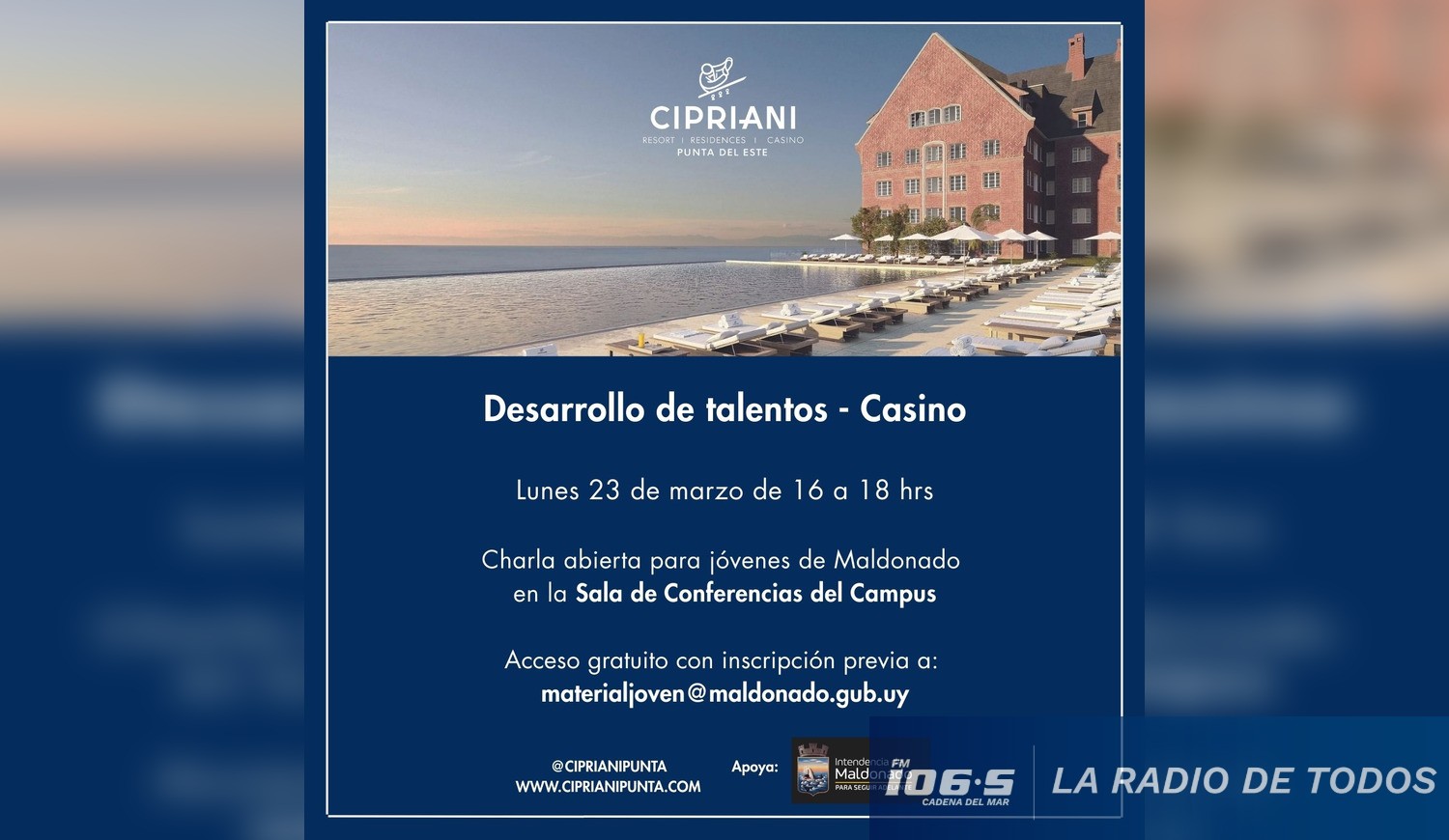 Esta actividad es gratuita y cuenta con el apoyo de la Intendencia Departamental de Maldonado, a través de la Dirección de Infancia, Adolescencia y Juventud, quien valora la oportunidad dado que se trata de poder comenzar una carrera profesional que permitirá abrir puertas a un empleo de calidad a los jóvenes.