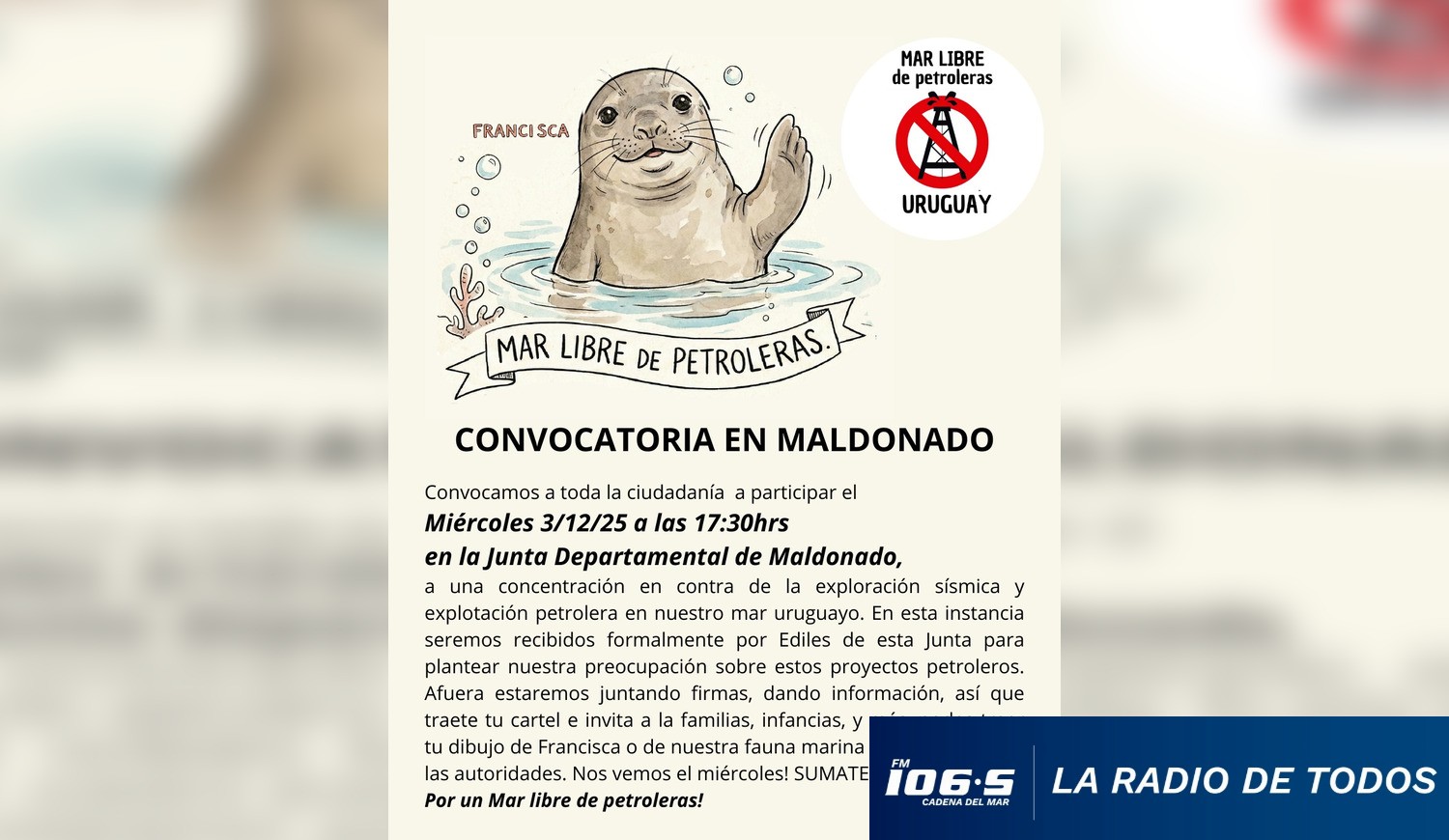 Este miércoles 3 de diciembre, a las 17.30 horas, se realizará mnifestación en la Junta Departamental de Maldonado, convocada por organizaciones ambientales, vecinos y defensores del ecosistema marino, en rechazo a los proyectos de exploración sísmica y explotación petrolera en aguas uruguayas.