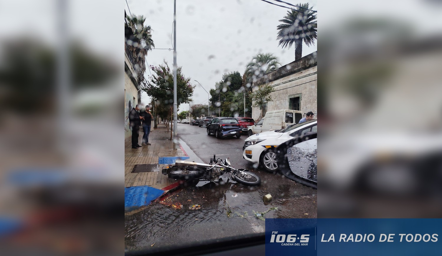 Una motocicleta impactó contra la parte trasera de un automóvil en la intersección de las calles San Carlos e Ituzaingó. El accidente ocurrió este sábado bajo condiciones climáticas adversas que dificultaban la visibilidad y el frenado en el pavimento mojado.