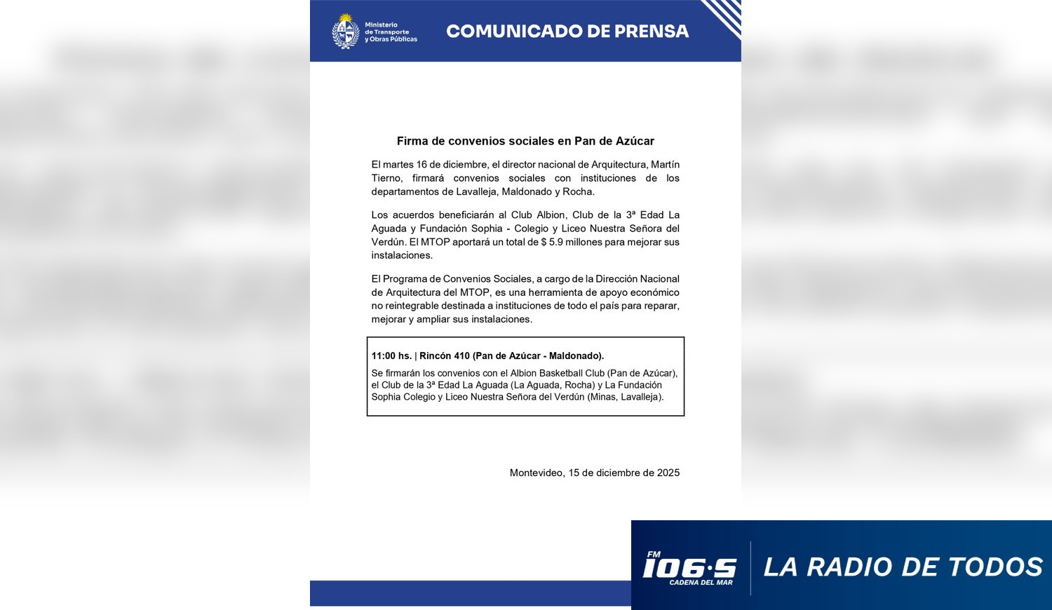 Según un comunicado de prensa del Ministerio de Transporte y Obras Públicas (MTOP), el Director Nacional de Arquitectura, Martín Tierno, firmará este martes 16 de diciembre convenios sociales con instituciones de los departamentos de Lavalleja, Maldonado y Rocha.