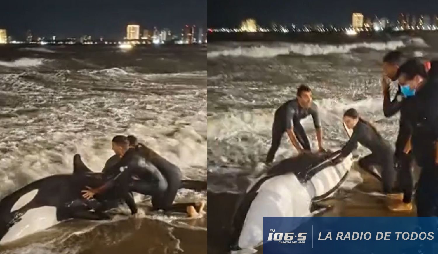 Las imágenes muestran al animal en la orilla, afectado por el oleaje y con signos de debilidad, mientras rescatistas intentan reposicionarlo en el agua.