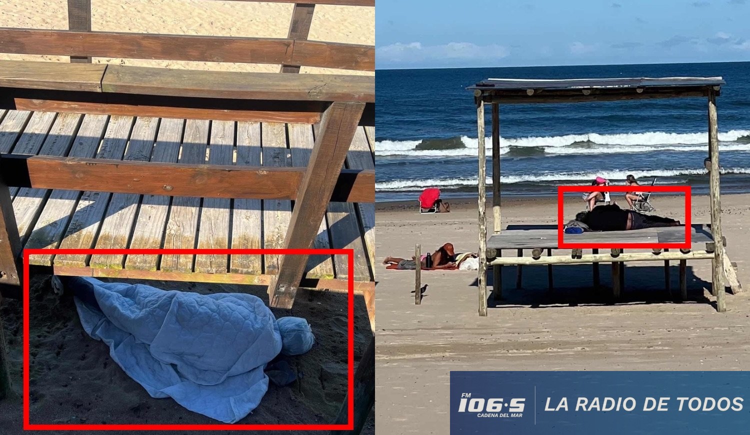 Las imágenes a las que accedió nuestro compañero periodista Matias Napilotti muestran a una persona instalada debajo de una estructura de madera sobre la arena, utilizando ropa de cama para resguardarse.