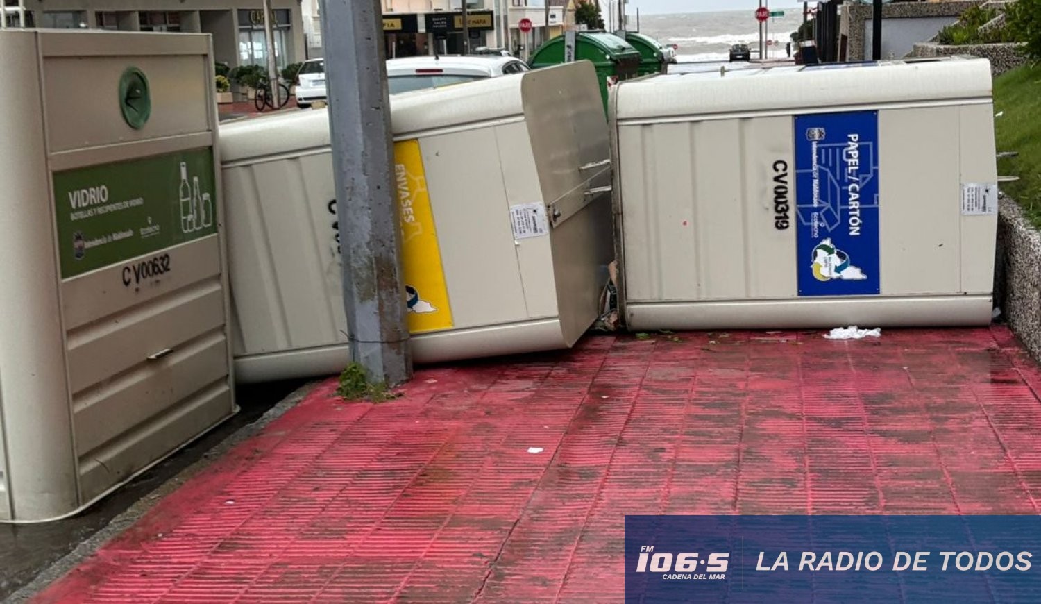 Metros más adelante, en calle 29, entre Avenida Gorlero y Calle 20, las ráfagas de viento volcaron varios contenedores de gran porte.