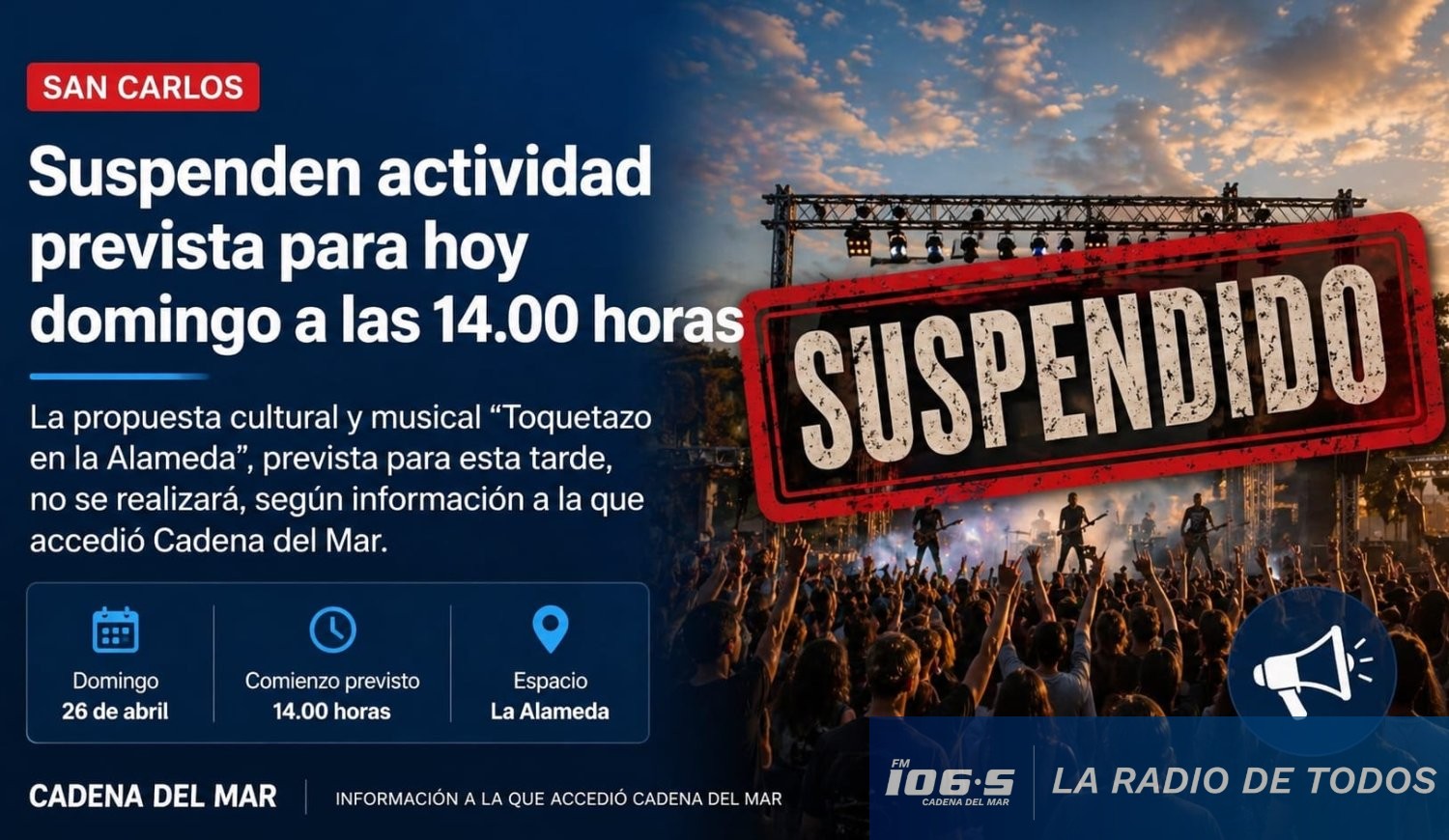 La propuesta cultural y musical (“Toquetazo en la Alameda”), prevista para esta tarde, no se realizará, según información a la que accedió Cadena del Mar.