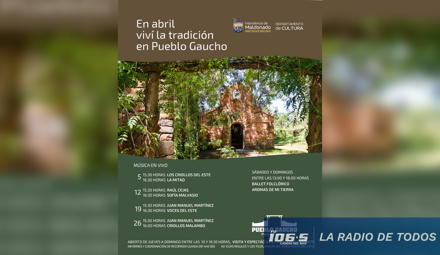 El museo vivo Pueblo Gaucho, ubicado en la intersección de la avenida Elías Regules y la calle Los Tilos, confirmó la grilla de propuestas que acompañarán el recorrido histórico durante el mes de abril.