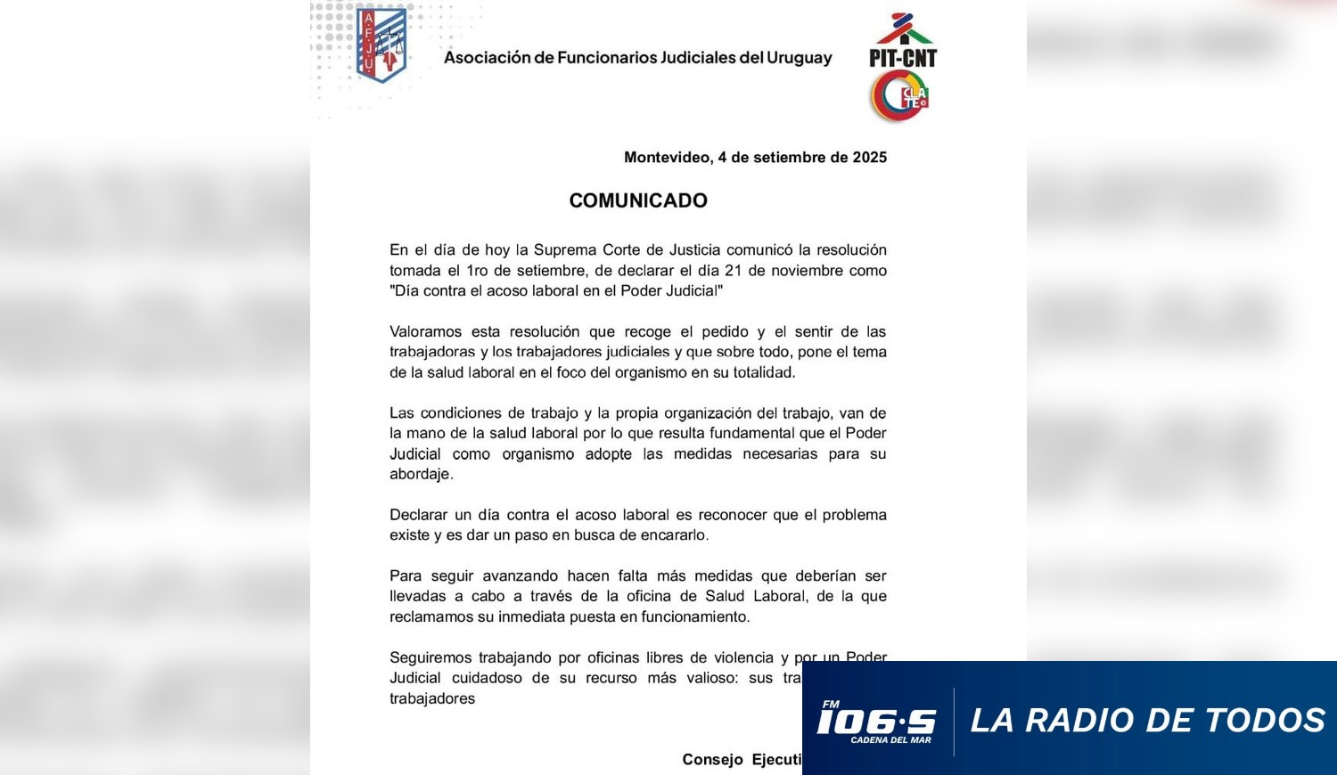 La Asociación de Funcionarios Judiciales del Uruguay emitió un comunicado en el que dio a conocer la resolución de la Suprema Corte de Justicia.