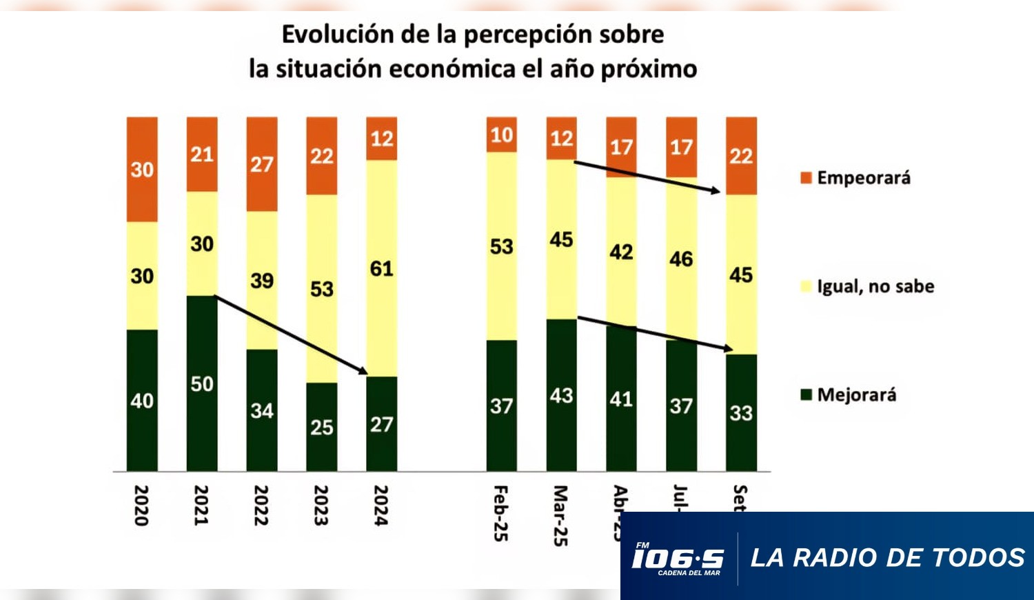 Consultados sobre el futuro cercano, 45% cree que la economía seguirá igual, 33% espera que mejore y 22% piensa que empeorará.