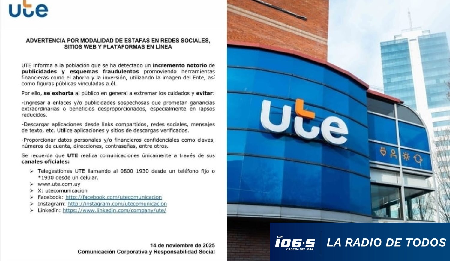 La Administración Nacional de Usinas y Trasmisiones Eléctricas (UTE) emitió un comunicado urgente para advertir a la población sobre un "incremento notorio de publicidades y esquemas fraudulentos" en redes sociales y plataformas en línea.