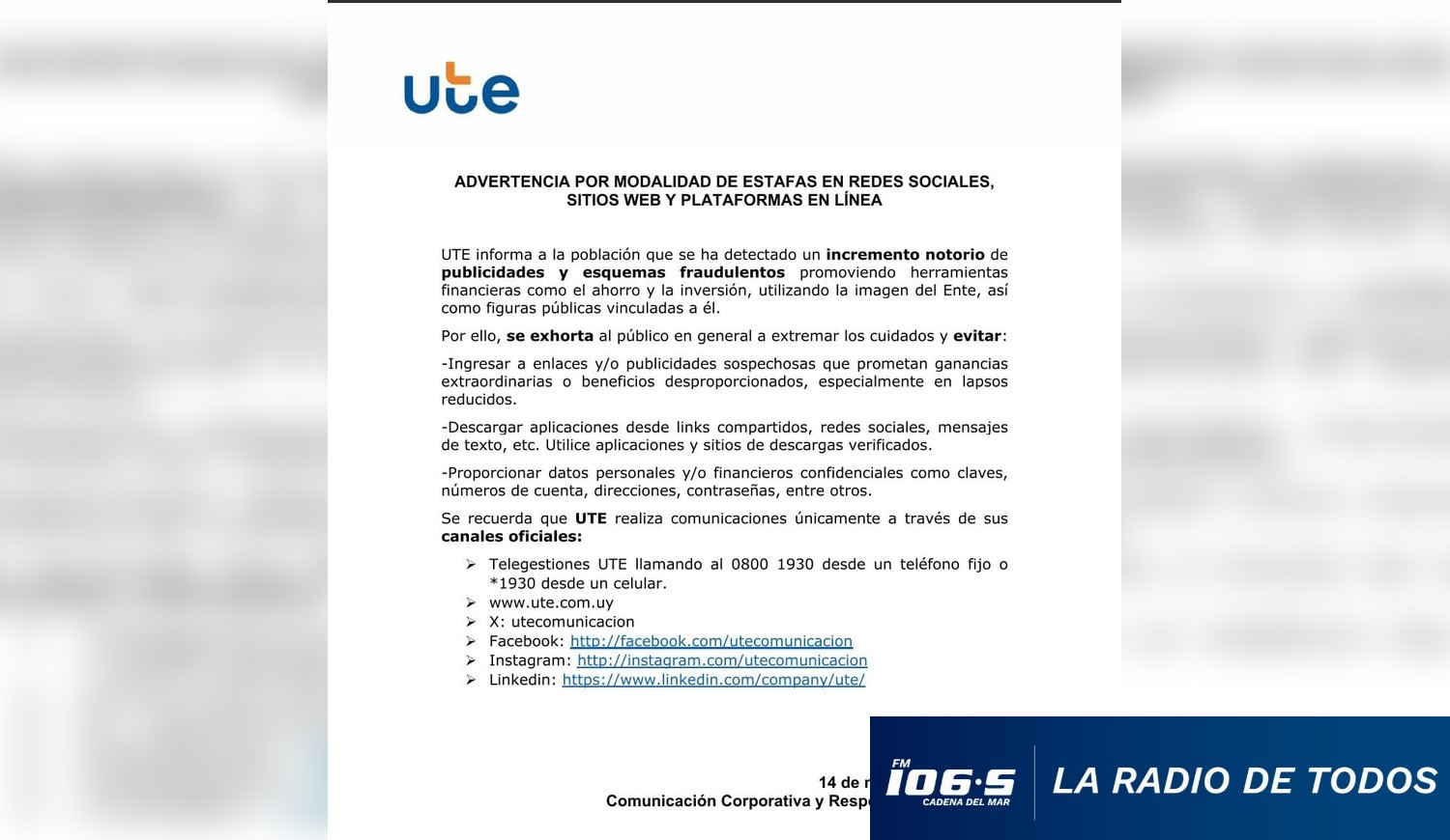 UTE recuerda que solo realiza comunicaciones oficiales a través de los siguientes canales: