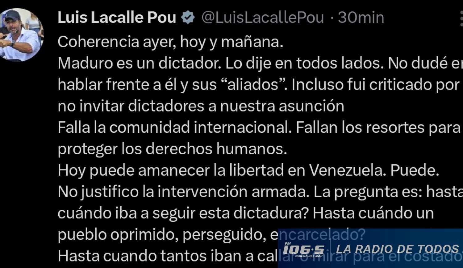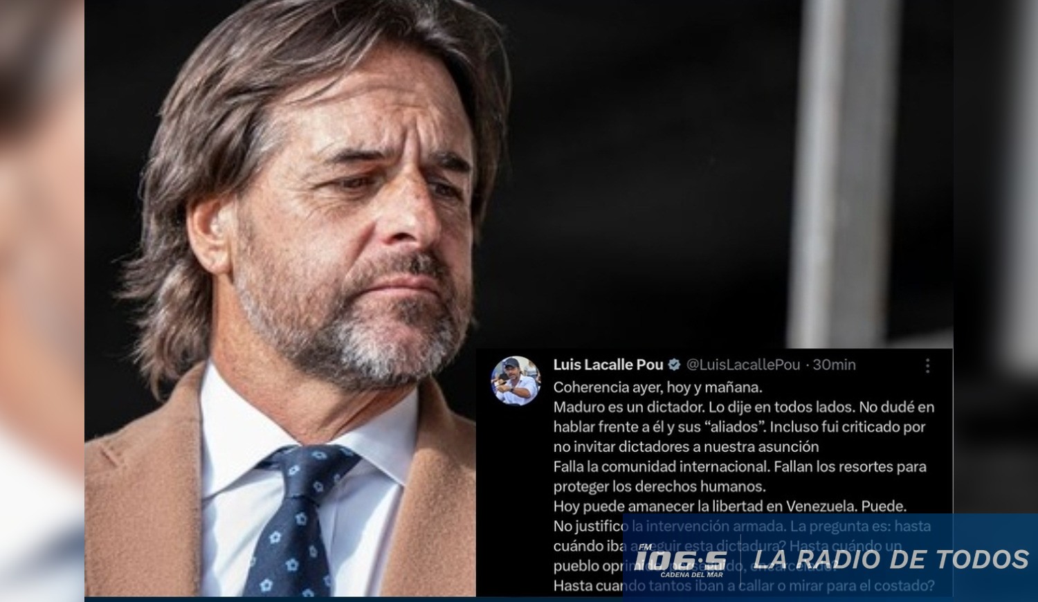 El expresidente de la República, Luis Lacalle Pou, se manifestó este sábado sobre la situación en Venezuela, apelando a la "coherencia" que ha mantenido a lo largo de su carrera política respecto al régimen de Nicolás Maduro.