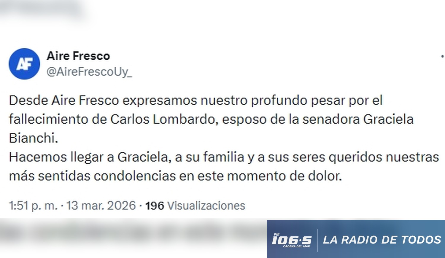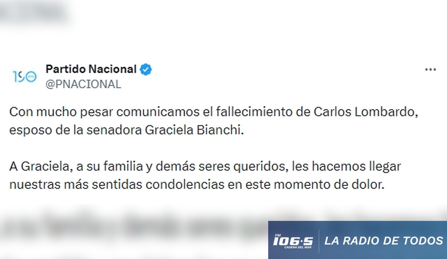La noticia del deceso de Carlos Lombardo, cónyuge de la legisladora nacionalista Graciela Bianchi, ha generado una inmediata respuesta de solidaridad en todo el arco político uruguayo. El Partido Nacional expresó sus condolencias oficiales ante esta pérdida familiar, marcando una jornada de reflexión institucional.