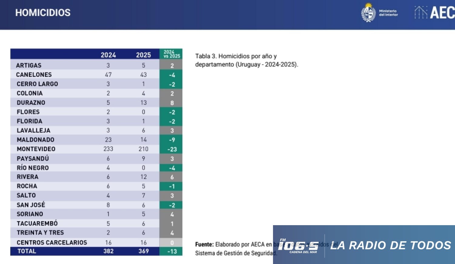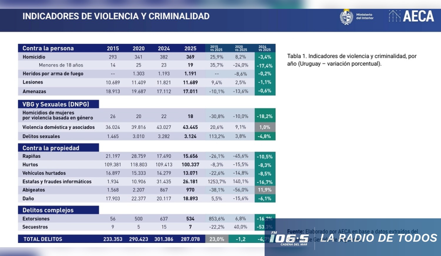 Por otra parte, en otros delitos, Cadena del Mar pudo saber que las rapiñas bajaron poco más de un 40 % en comparación al año 2024, y que los hurtos bajaron cerca del 20 %.