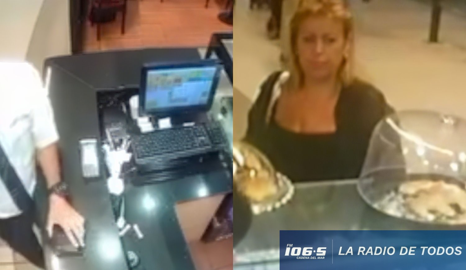 En ese instante, una mujer de cabello rubio que se encontraba en el lugar tomó el objeto desde arriba del mostrador y lo guardó directamente en su cartera, retirándose del sitio con aparente tranquilidad.