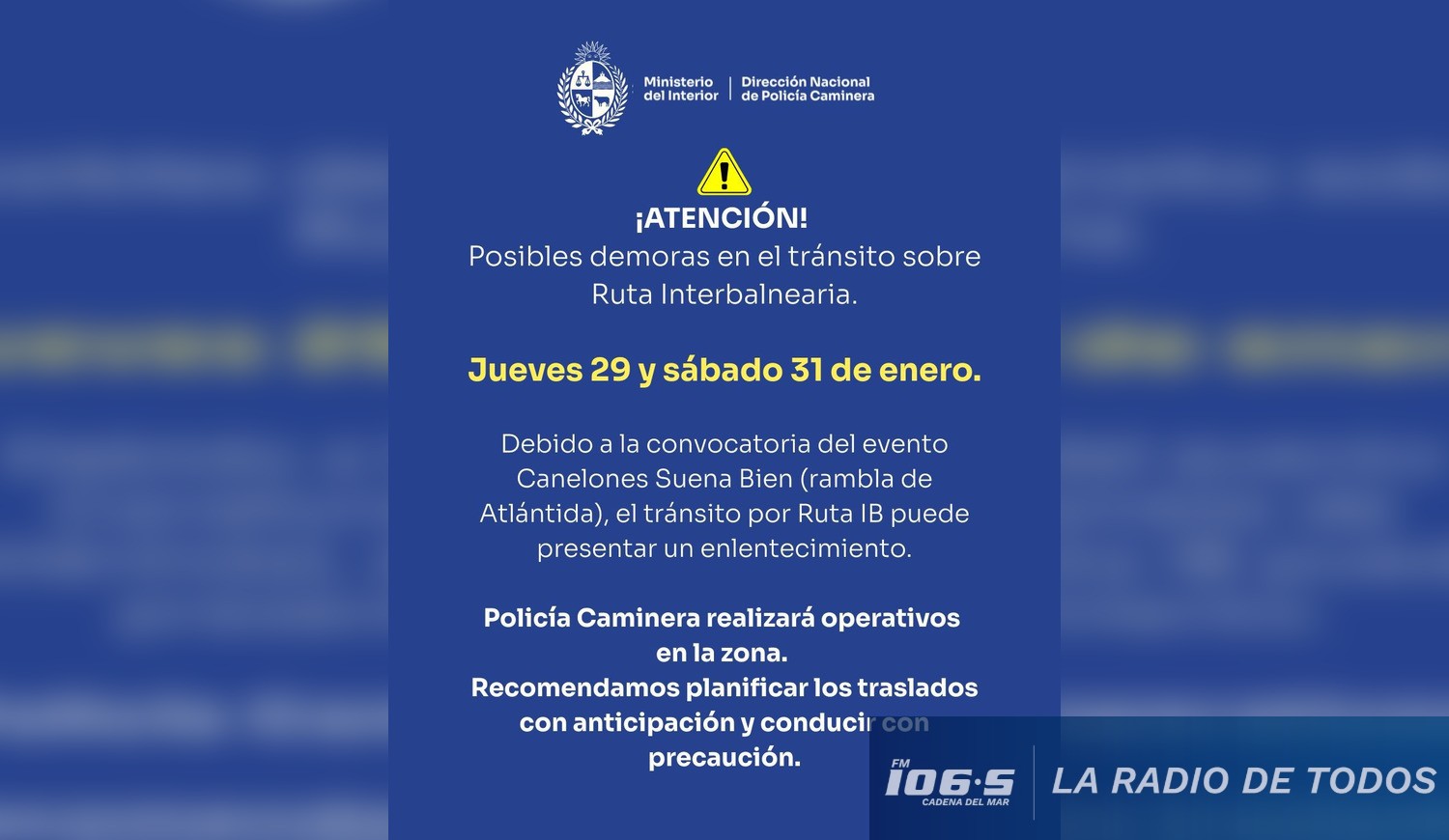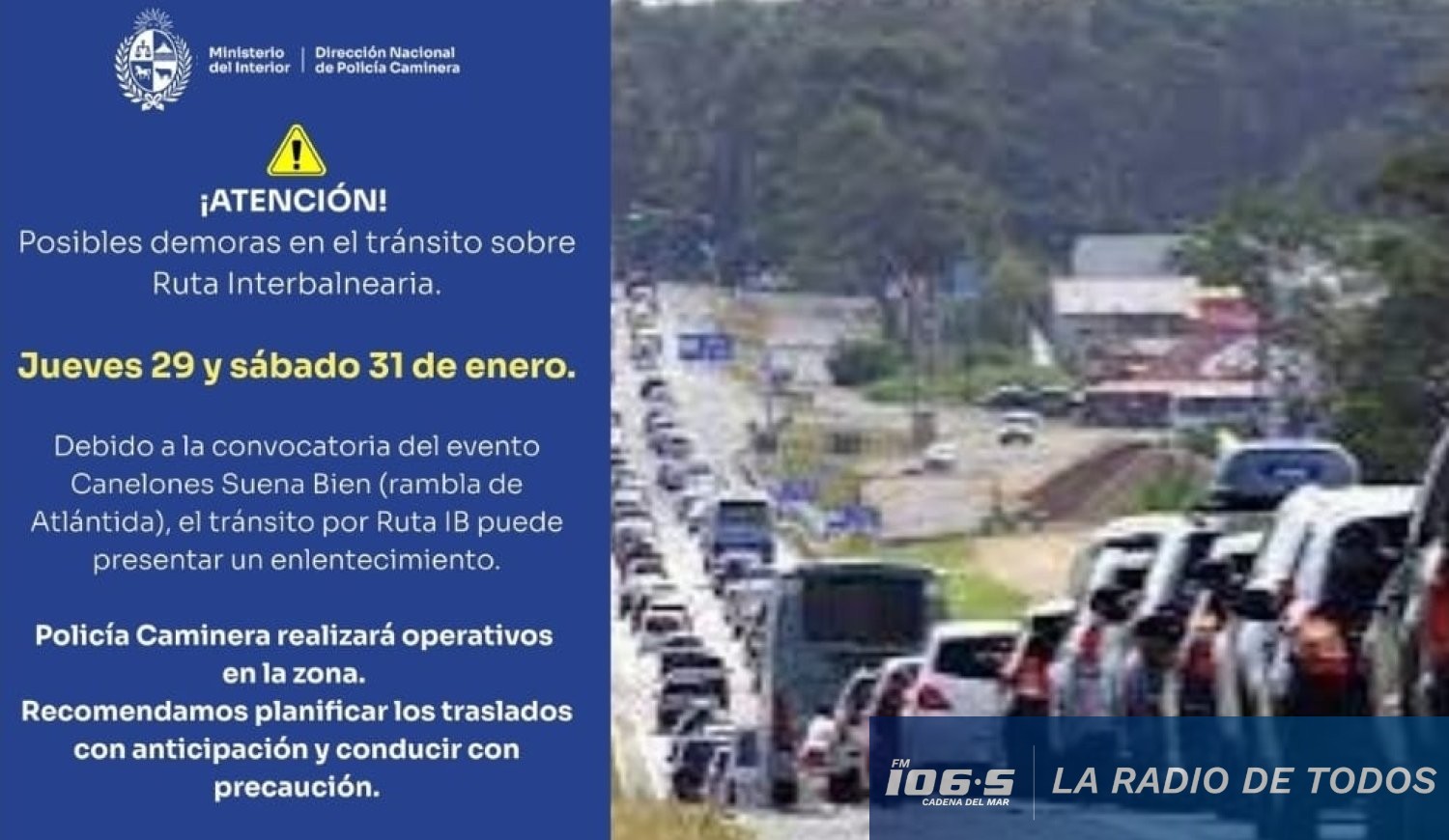 El aviso oficial emitido por el Ministerio del Interior señala que la gran convocatoria esperada para el evento "Canelones suena bien", que tendrá lugar en la rambla de Atlántida, impactará directamente en el flujo vehicular de la ruta Interbalnearia.
