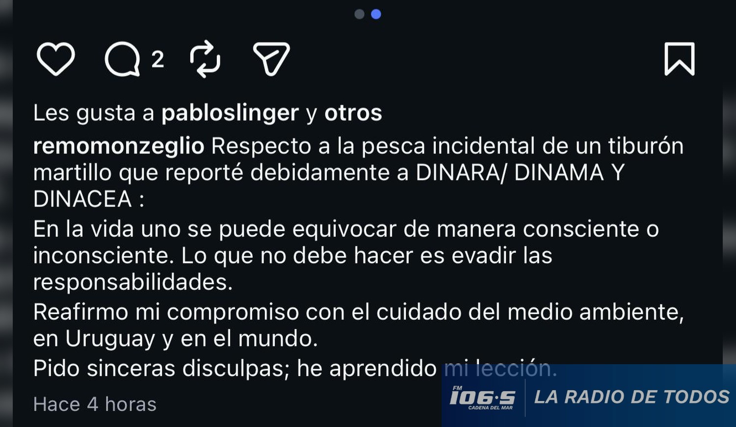 El exsubsecretario de Turismo utilizó sus redes sociales para pedir disculpas tras publicar la captura de un tiburón sarda. El exjerarca admitió que desconocía la prohibición que protege a esta especie en aguas uruguayas.