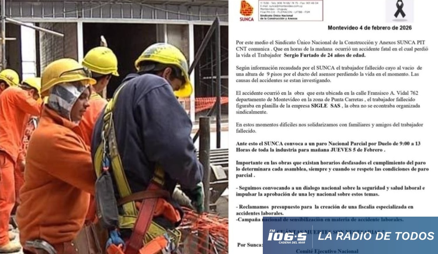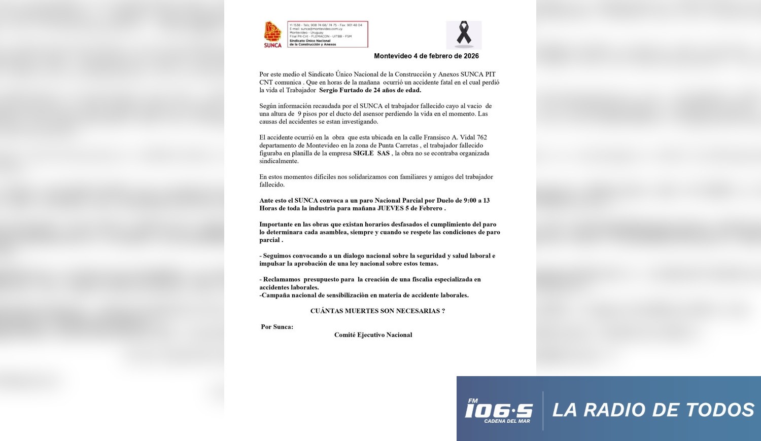 El fallecimiento de un obrero de 24 años en una construcción de Montevideo motivó la convocatoria de un paro nacional parcial por parte del SUNCA. El sindicato reclama medidas urgentes para mejorar la seguridad laboral y una ley nacional que regule la prevención de accidentes en el sector.