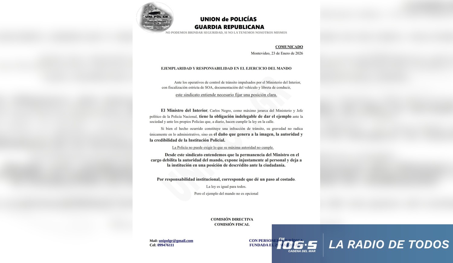 La agrupación policial emitió un comunicado luego del siniestro que protagonizó el Ministro Carlos Negro, al no respetar un cartel de pare e impactar contra una motocicleta que iba a alta velocidad. En tal sentido, el gremio entiende que el jerarca debería desvincularse del cargo.