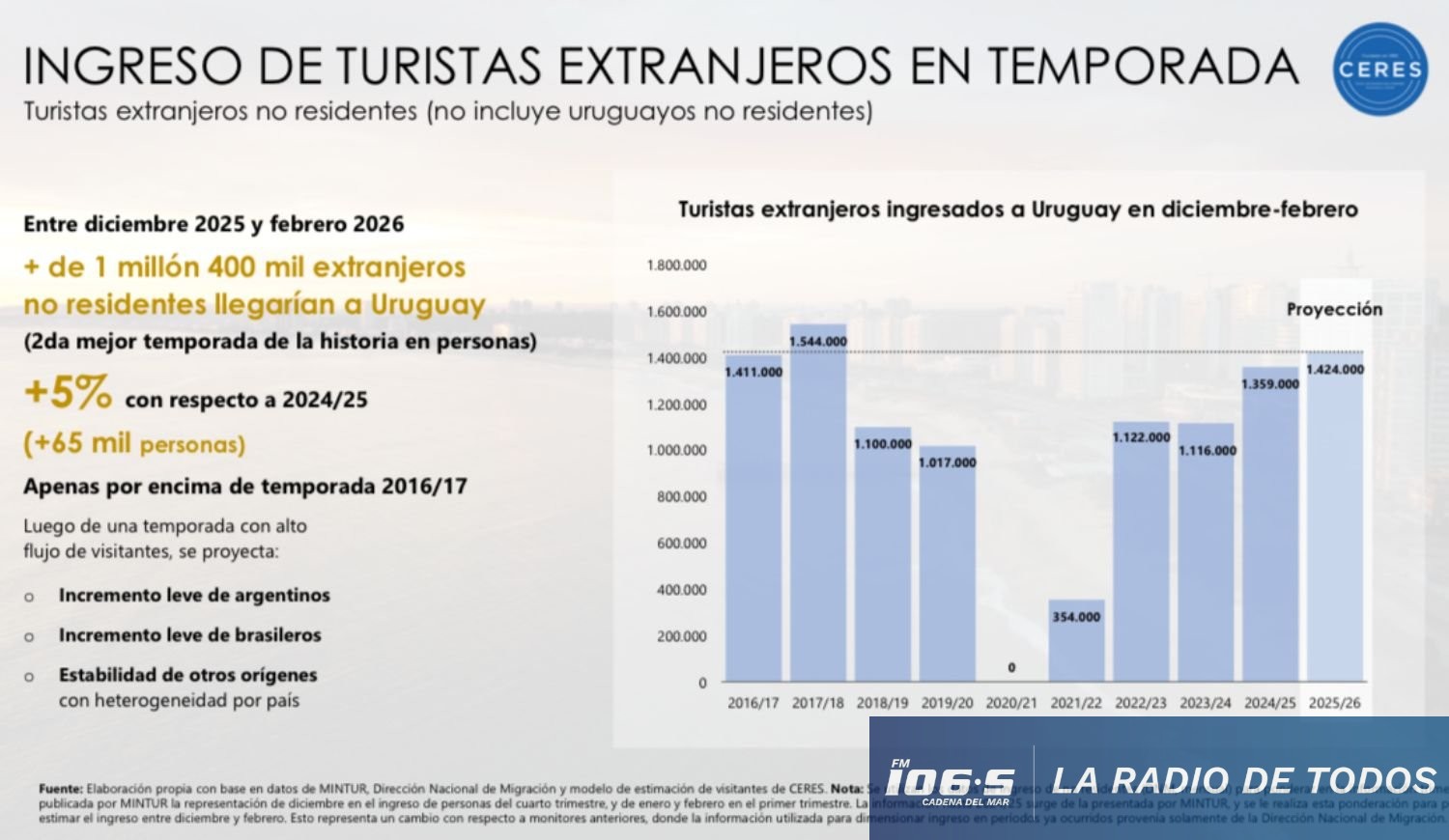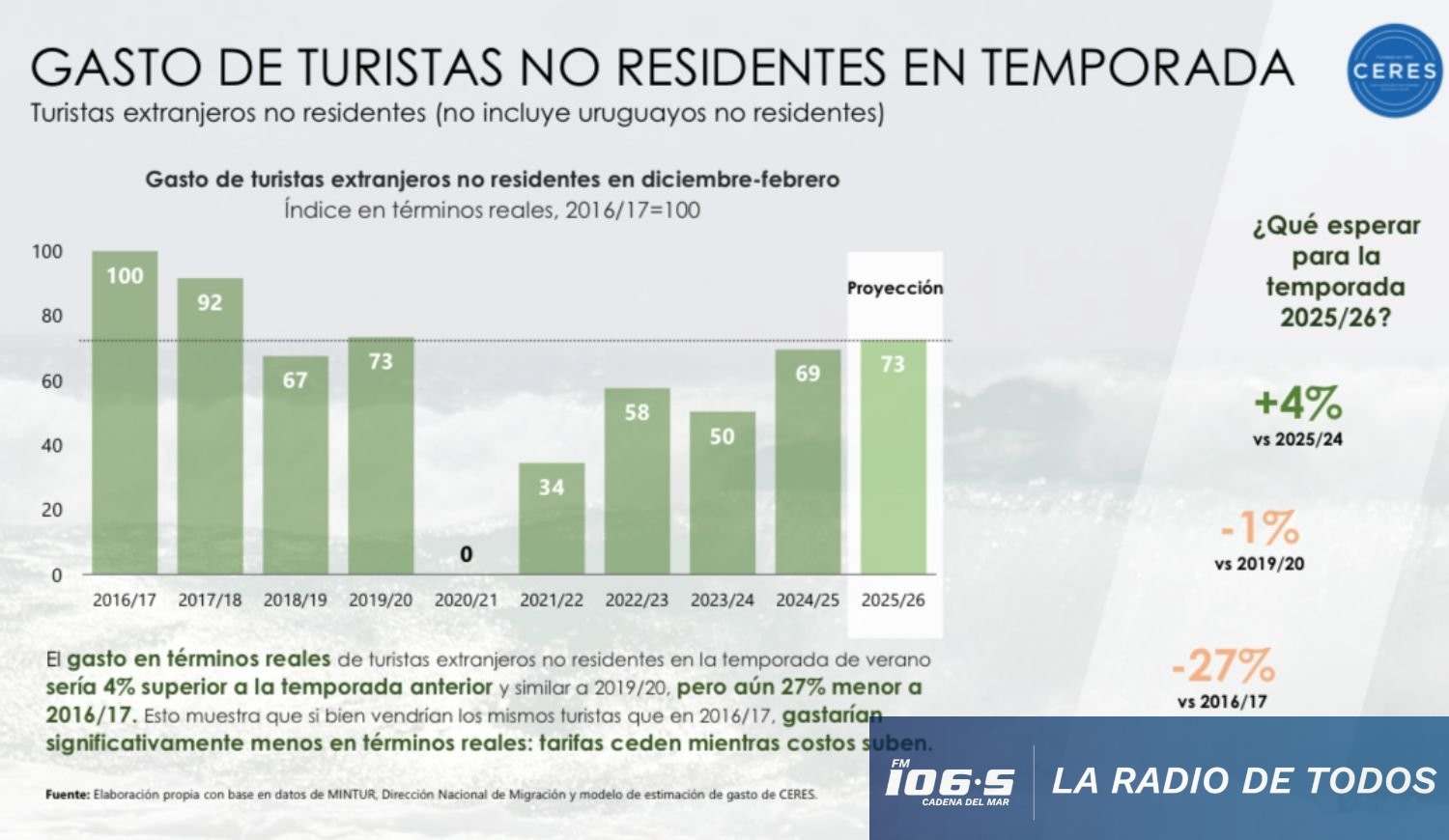 Uno de los datos más relevantes del Monitor está vinculado a la próxima temporada de verano. CERES estima que entre diciembre y febrero llegarán a Uruguay más de 1.411.000 turistas extranjeros no residentes, lo que posicionaría a la temporada 2025-2026 como la segunda mejor de la historia en cantidad de visitantes, apenas por detrás del récord alcanzado en 2016-2017. En términos de gasto, se proyecta un crecimiento cercano al 4 % en términos reales respecto al verano anterior, aunque todavía un 27 % por debajo del máximo histórico registrado en aquel período.