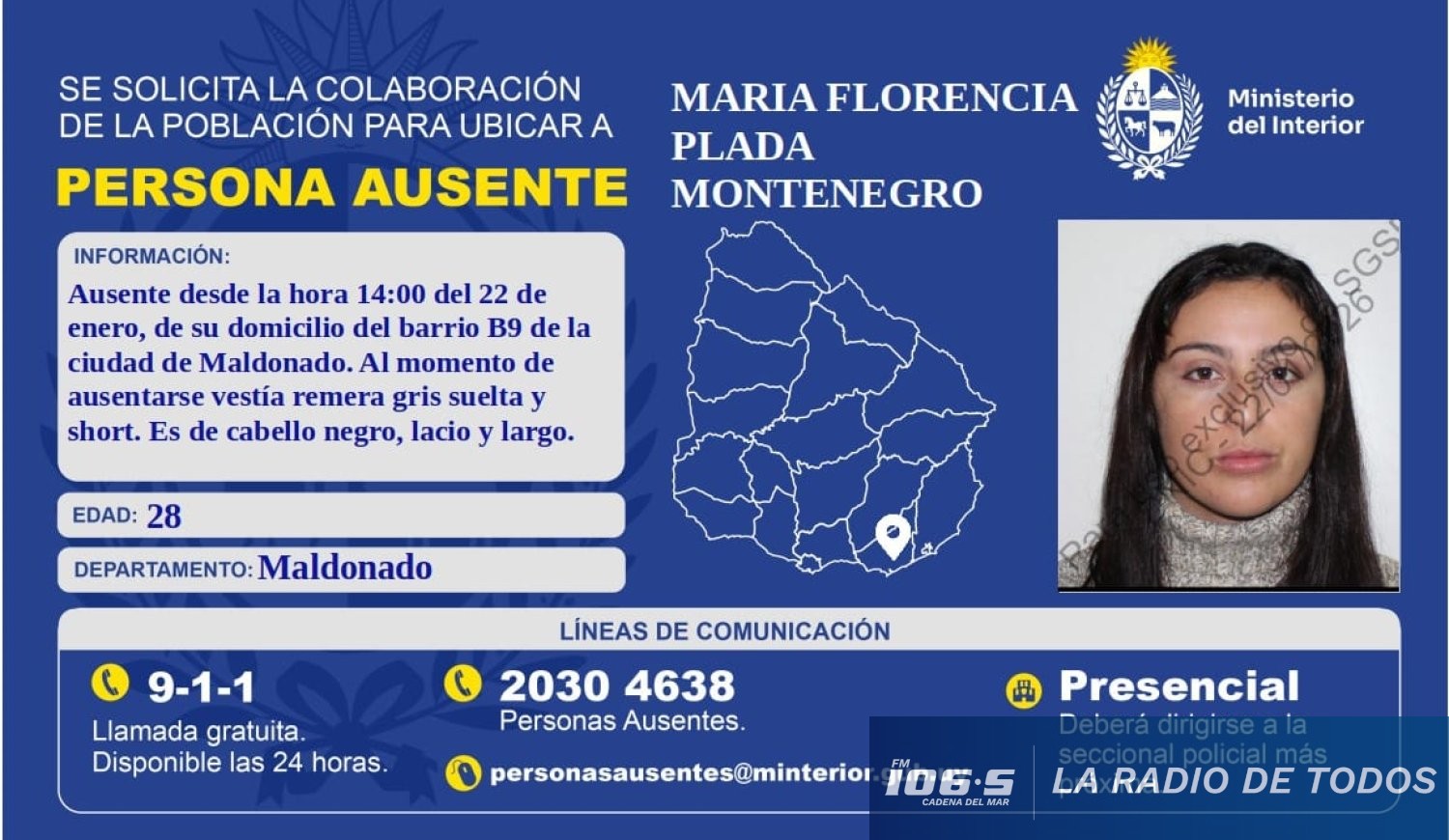 El Ministerio del Interior solicita la colaboración de la población para ubicar a Maria Florencia Plada Montenegro, de 28 años, ausente desde la tarde de hoy, jueves 22 de enero a las 14:00 horas.