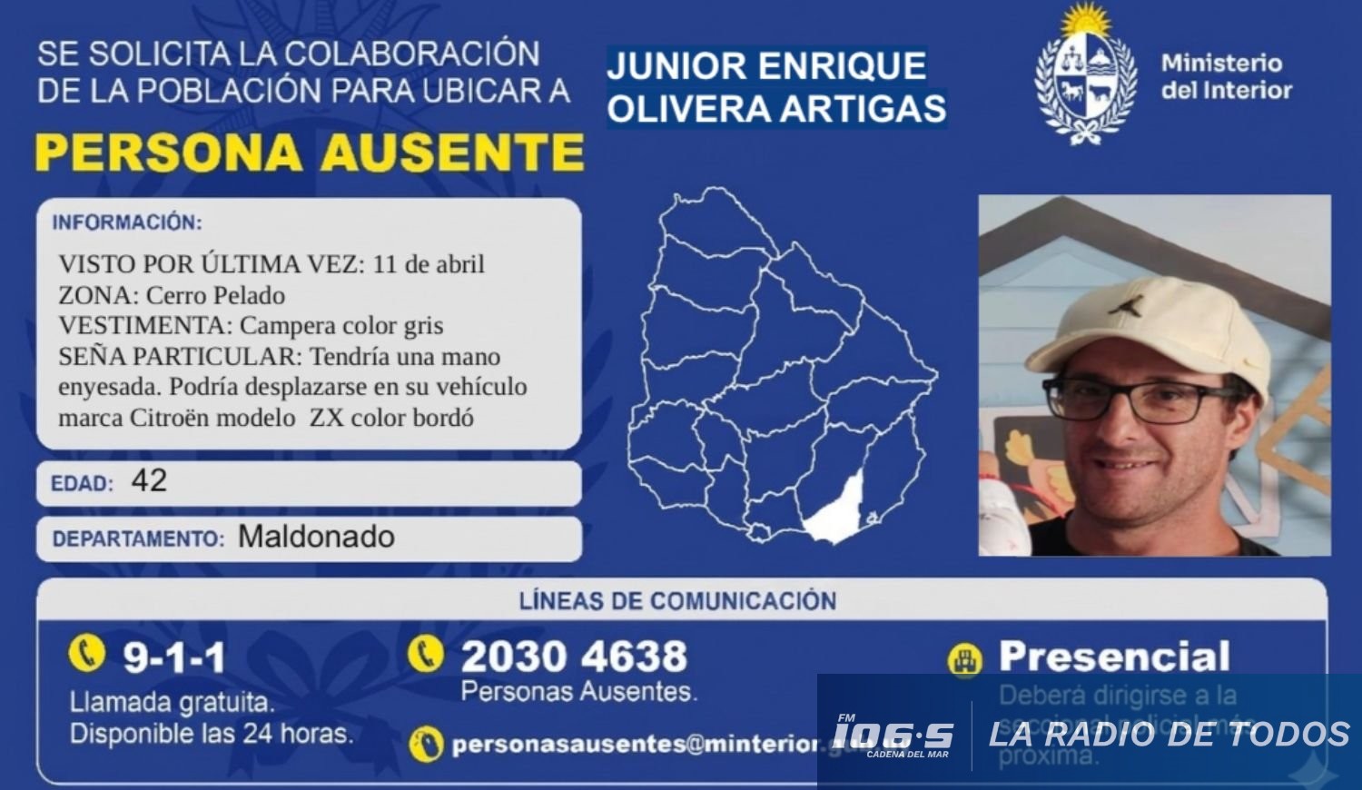 La Jefatura de Policía de Maldonado emitió un comunicado solicitando la colaboración de la población para dar con el paradero de Junior Enrique Olivera Artigas, un hombre de 42 años que fue visto por última vez el pasado 11 de abril en la zona de Cerro Pelado.