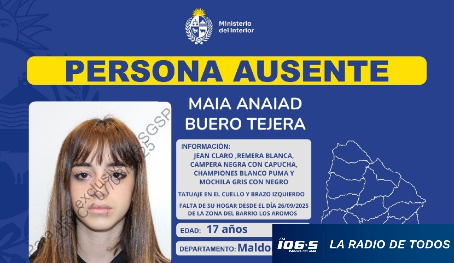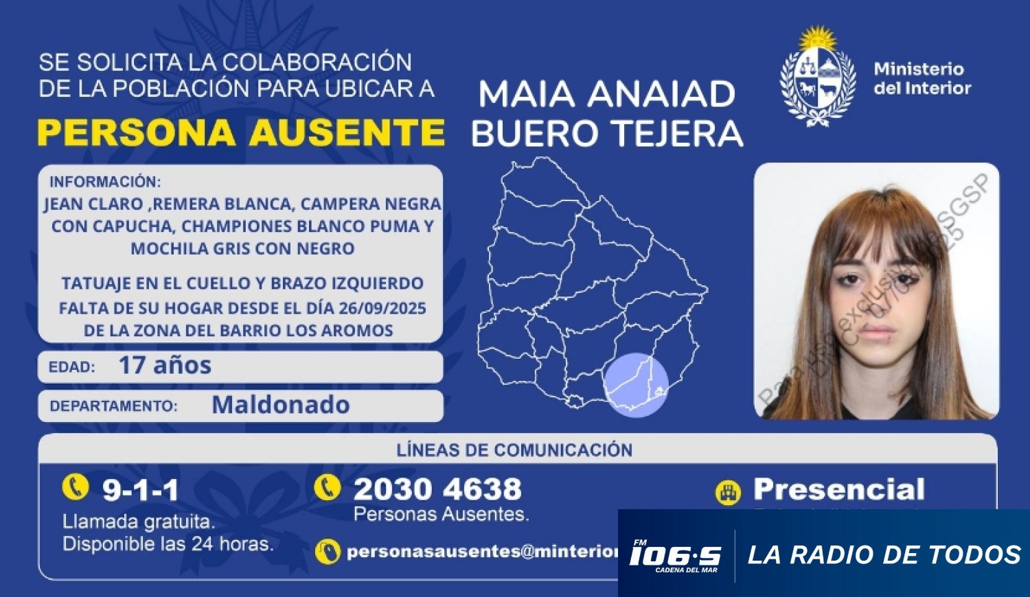 La Jefatura de Policía de Maldonado solicita la colaboración de la población y de los medios de prensa para ubicar a Maia Anaiad Buero Tejera, de 17 años.