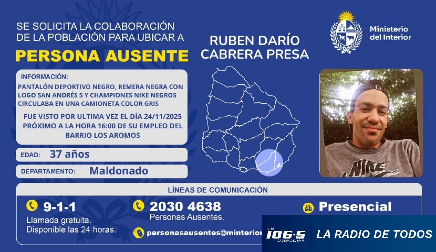 La persona de 37 años fue vista por última vez el día 24 de noviembre, próximo a las 16.00 horas, en su empleo en el barrio Los Aromos, Maldonado.