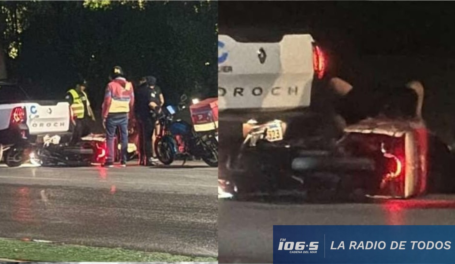 De acuerdo con las imágenes registradas en el sitio por oyentes de Cadena del Mar, el impacto ocurrió en la parte posterior de la camioneta, dejando a la motocicleta caída sobre el pavimento.