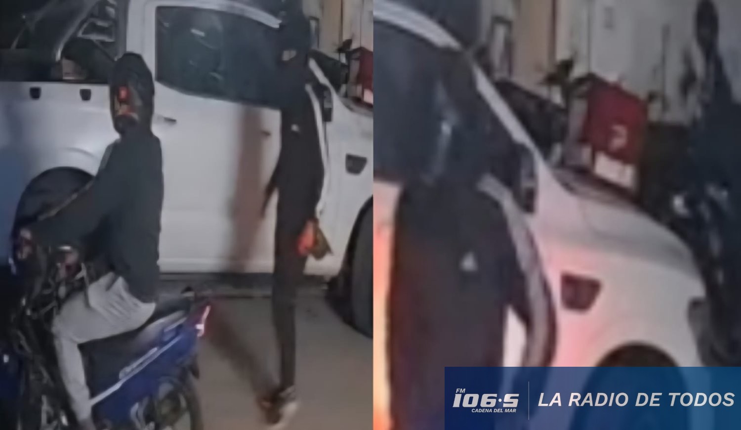 Imágenes enviadas por oyentes de Cadena del Mar captaron a los delincuentes ingresando al estacionamiento, ambos con cascos completos que les ocultaban completamente el rostro.