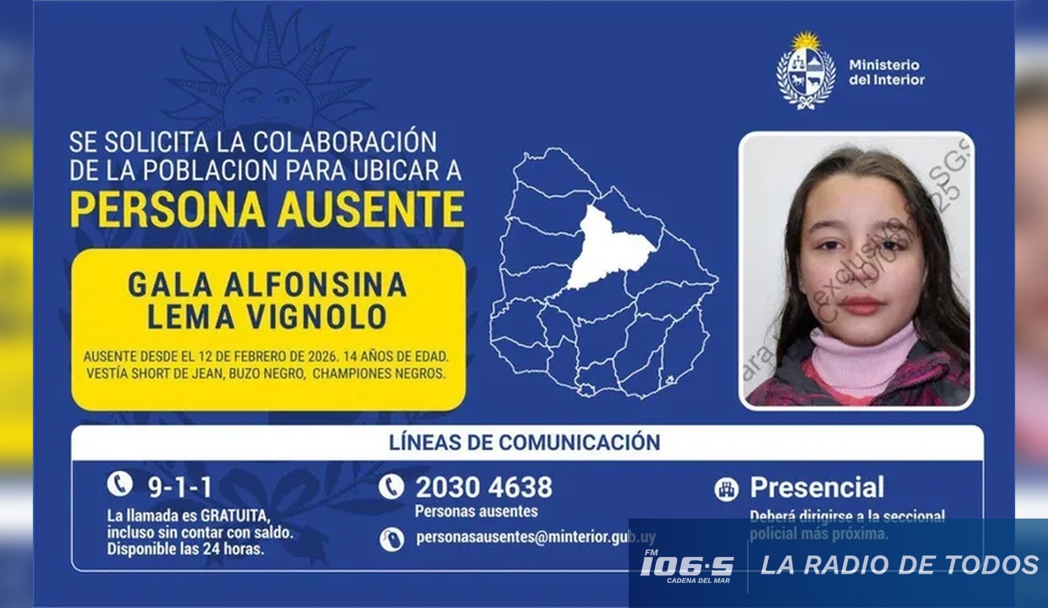 El Ministerio del Interior y las autoridades policiales de Tacuarembó iniciaron un operativo de búsqueda tras la desaparición de Gala Alfonsina Lema Vignolo, una adolescente de 14 años.